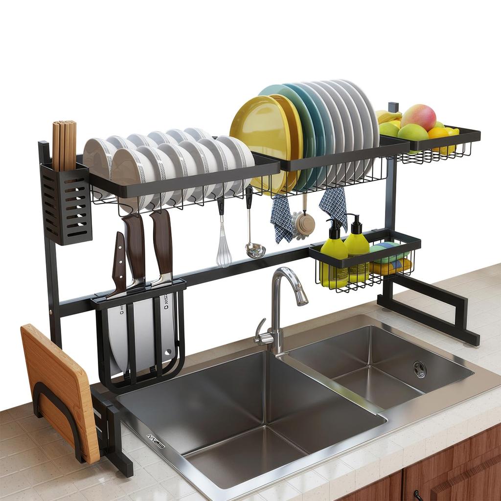 [Большая вместительная сушилка] Двухъярусная конструкция оставляет 80% столешницы свободной, что позволяет создать аккуратную и чистую кухню, не занимая много места.. Эта сушилка для посуды над раковиной может хранить различные кухонные принадлежности.. Имеются две полки с регулируемой высотой и длиной для хранения больших тарелок, мисок, горшков и растений.. Также имеется 1 держатель для столовых приборов, 1 держатель для разделочной доски, 1 держатель для ножей, 8 практичных крючков, 1 держатель для моющего средства и 1 прочный держатель для хранения чашек и бокалов для вина.