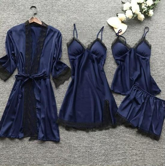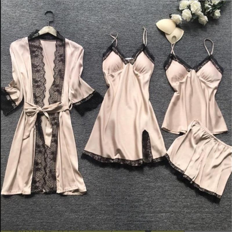 Женский атласный пижамный комплект: Из четырех частей с накладками на грудь, большой размер, весна и лето.
