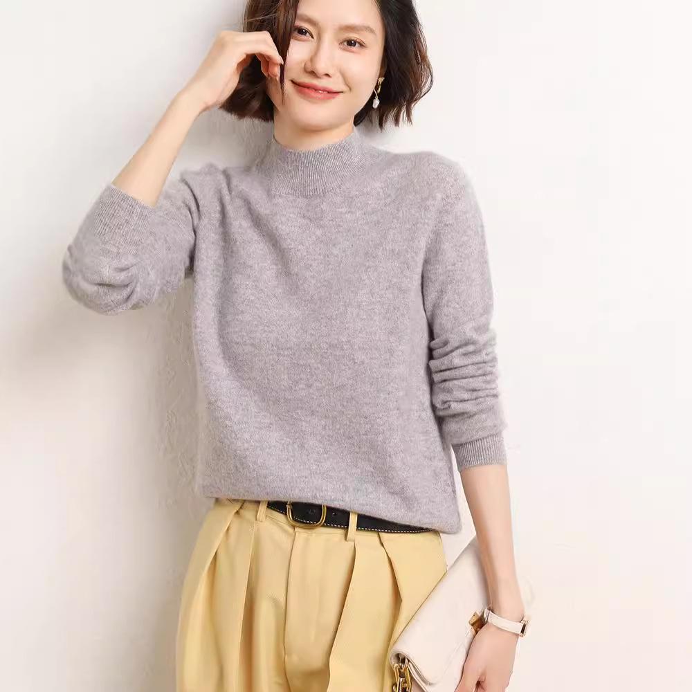 2024 Новый женский корейский стиль с полувысоким воротником и длинными рукавами, однотонный свитер, пуловер