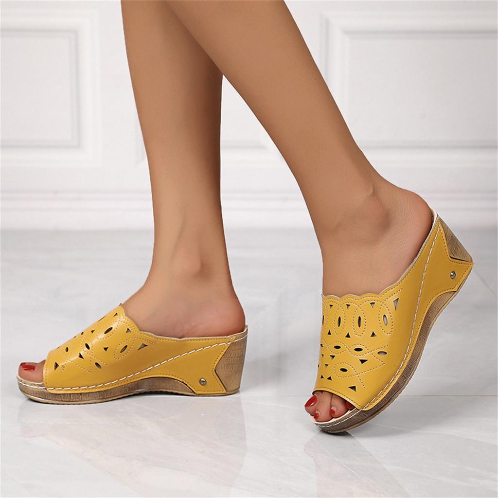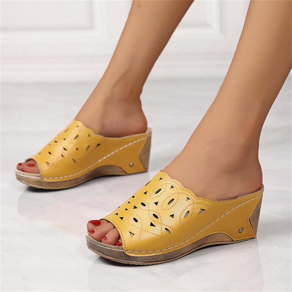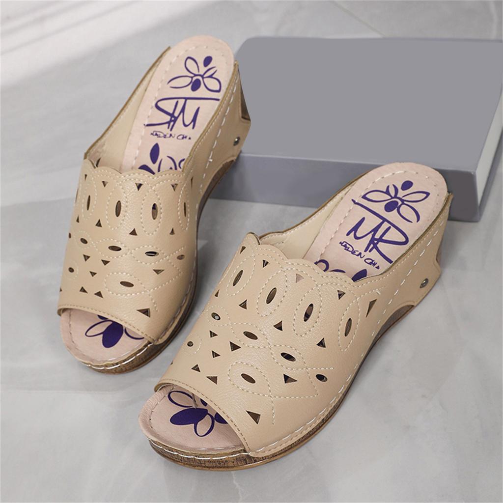 Женские сандалии Летние Кожаные С перфорацией С открытым носком На танкетке Римские сандалии Модные Однотонные Шлепанцы Каблуки