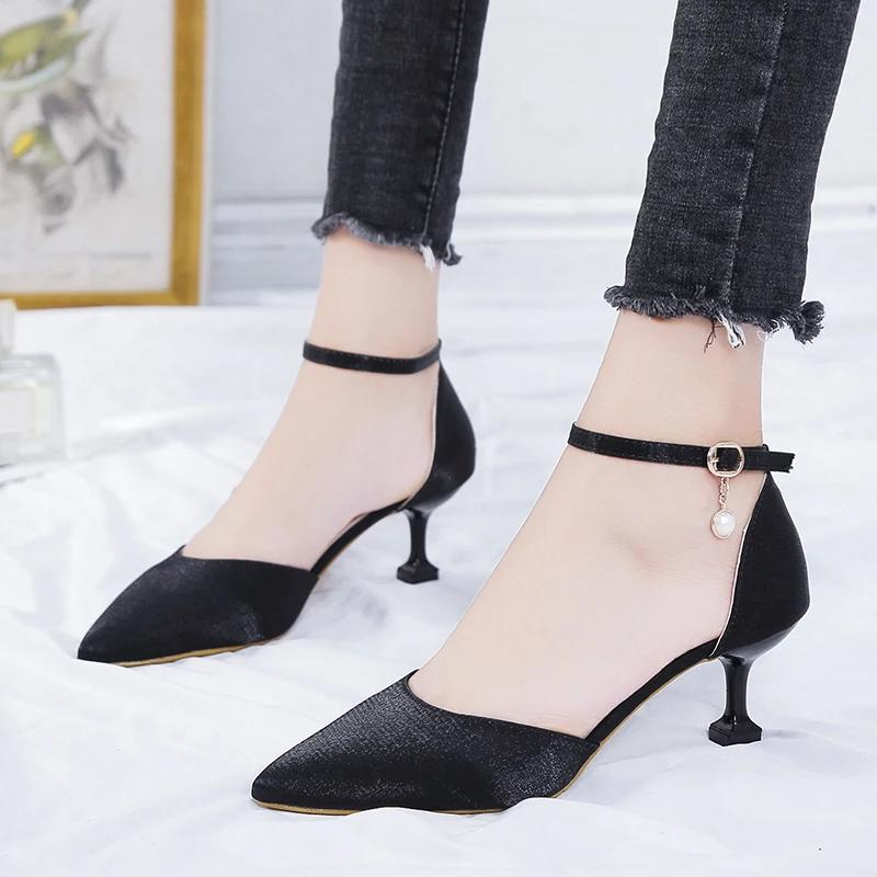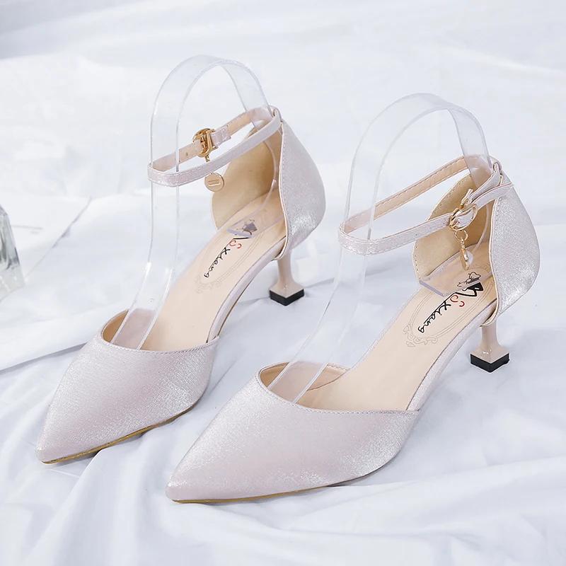 Летние новые модные босоножки женские с жемчужной цепочкой на щиколотке на шпильках с острым носком, повседневные туфли телесного цвета с пряжкой на ремешке для женщин
