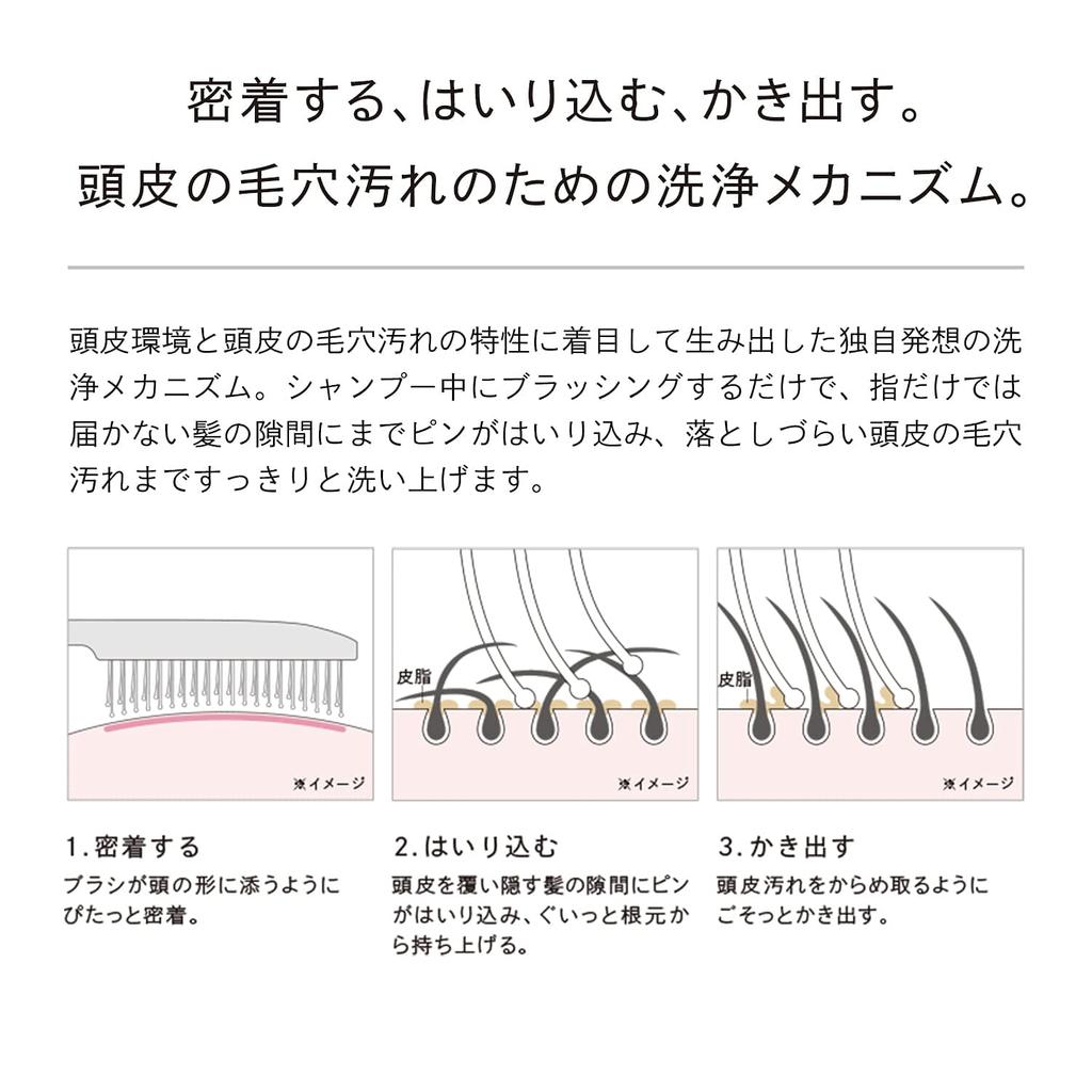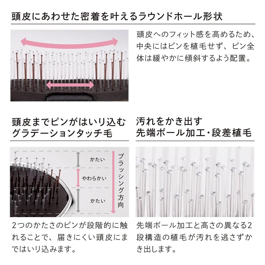 [Градиентное прикосновение волос, позволяющее штифтам проникать в кожу головы] Поэтапно касаясь штифтов двух степеней твердости, они проникают в труднодоступные участки кожи головы.
