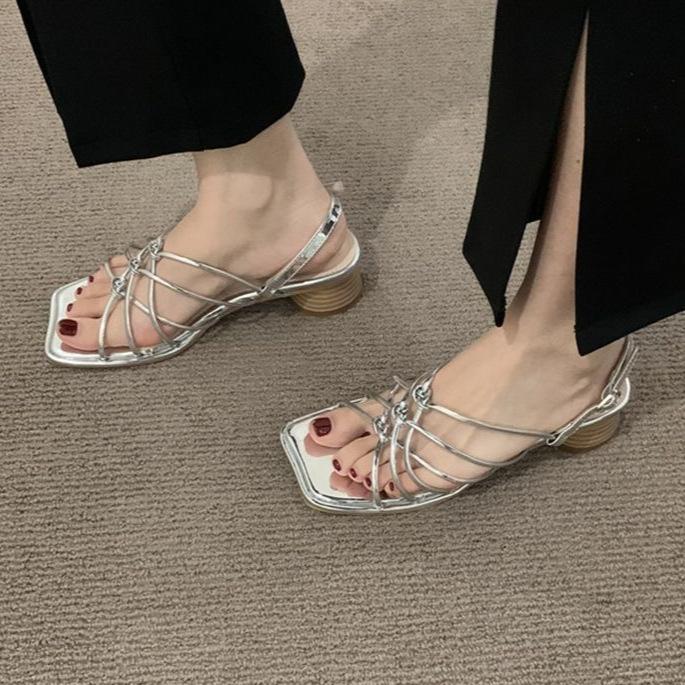 Дизайн Sense Niche Квадратная Голова Высокий Каблук Тапочки Серебряные Сандалии Женские Весенние Сандалии Модные Римские Туфли