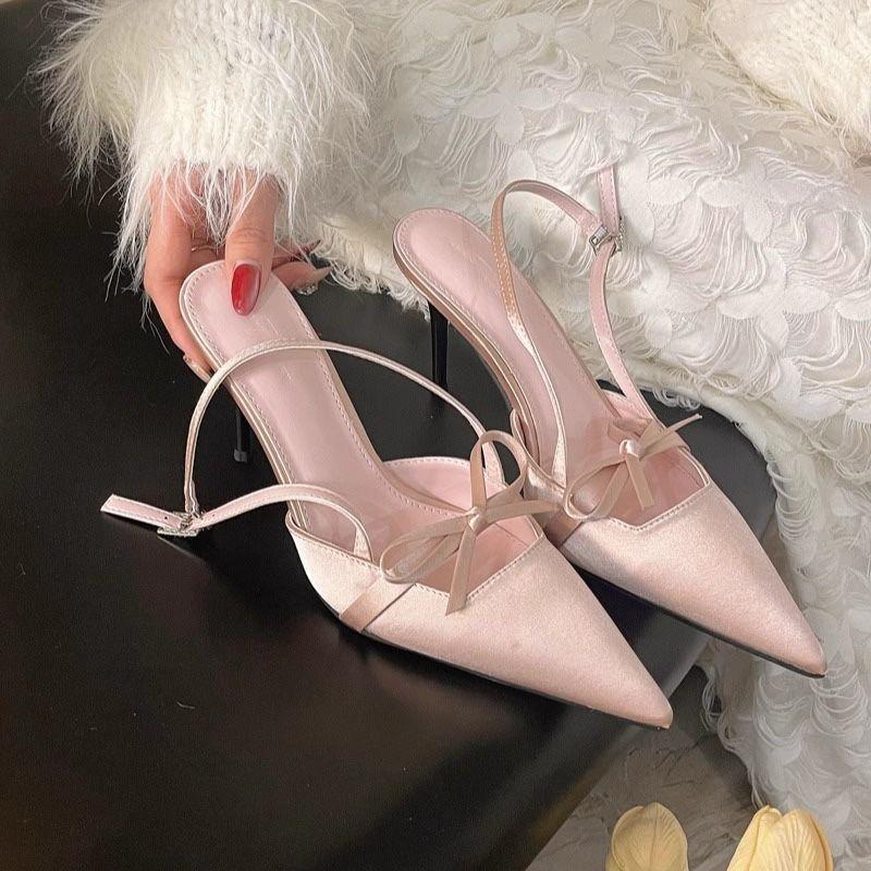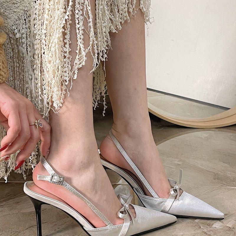 Новые босоножки с острым носком и бантом на высоком каблуке в китайском стиле с серебристым ремешком сзади и холодным ветром
