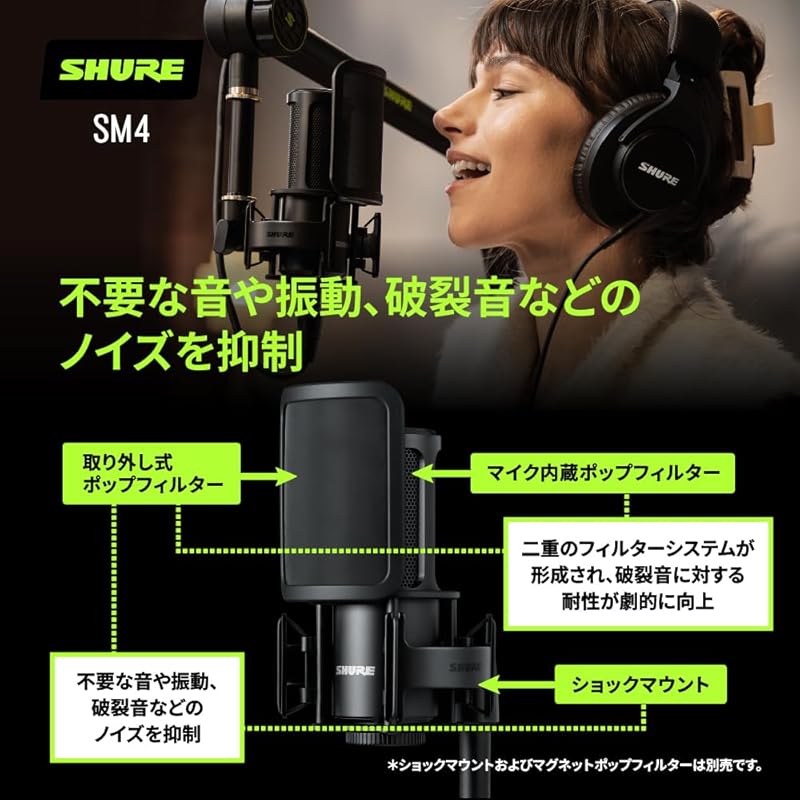[Suppresses noise such as unnecessary sounds, vibrations, and plosive sounds] The shock mount and removable pop filter* included in the SM4 home recording kit and sold separately are designed to suppress unwanted sounds, vibrations, and plosive sounds.suppresses noise.Combining the built-in microphone pop filter and the removable pop filter creates a dual filter system that dramatically increases immunity to plosive sounds.*Please note that this product is not included.