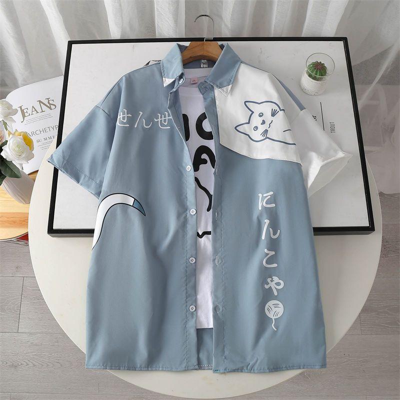 Летняя молодежная свободная повседневная рубашка с воротником-поло и принтом мультяшного кота с коротким рукавом