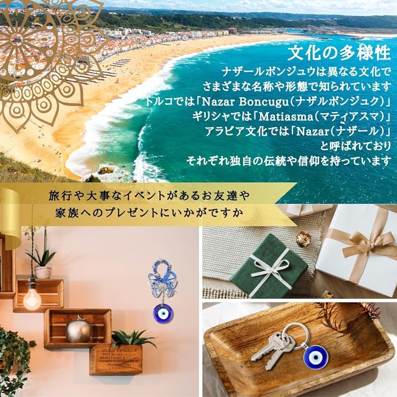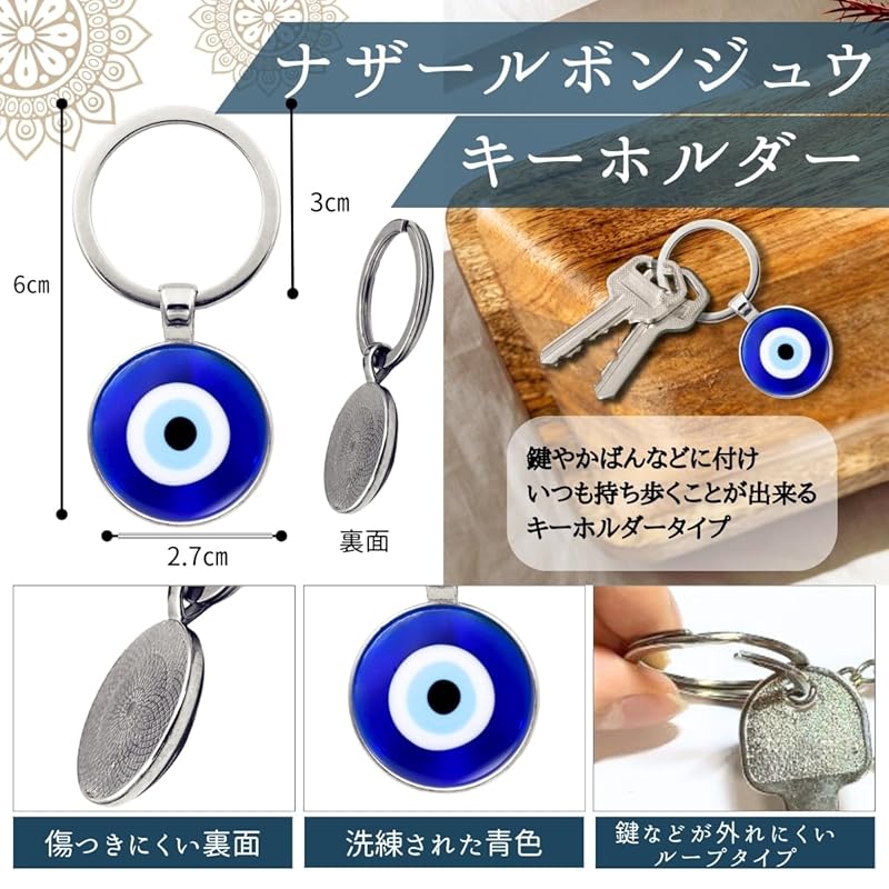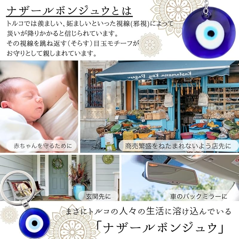 Особый предмет, который привнесет турецкие традиции в вашу повседневную жизнь. Этот брелок для ключей Nazarbonciu является символом турецкой истории и культуры. Его изысканный дизайн — прекрасная возможность привнести экзотическую нотку в вашу повседневную жизнь. [Размер] Настенный: приблизительно. 17см x диаметр 5см, брелок: приблизительно. 6 см x диаметр примерно. 2,7 см [Содержимое набора] Настенное украшение Nazar Bonju x 1, брелок (тип петли) х 1