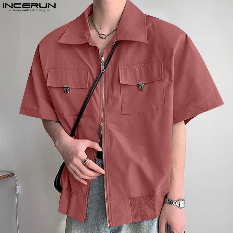 INCERUN Мужские повседневные рубашки-карго с воротником-лацканами и коротким рукавом на молнии