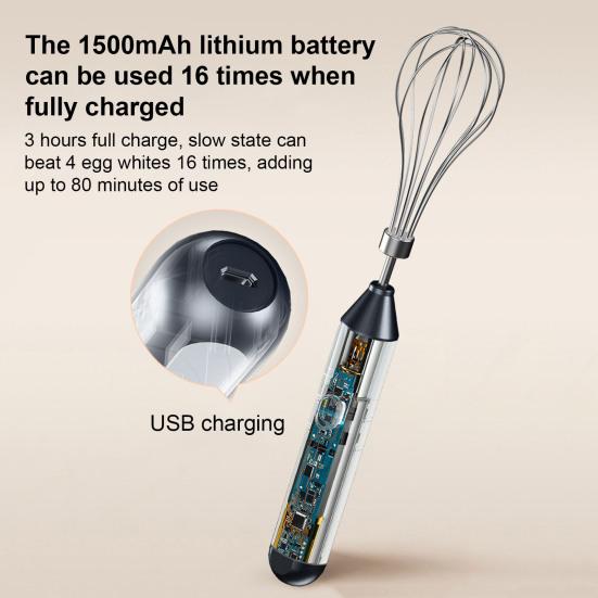 Портативная электростанция: Благодаря перезаряжаемому литиевому аккумулятору емкостью 800 мАч и порту зарядки USB типа C эта ручная мешалка рассчитана на 16 использований при полной зарядке.. Наслаждайтесь удобством взбивания сливок или нарезки овощей в любом месте и в любое время!