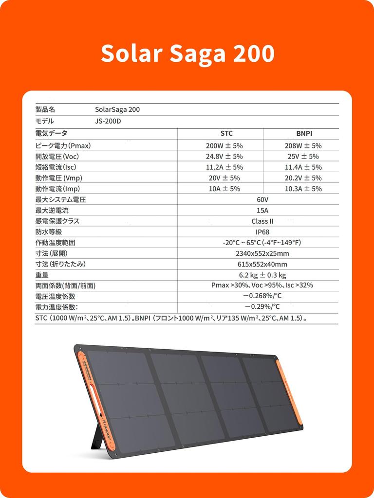 [Использует американскую технологию солнечных элементов] Jackery SolarSaga 200 оснащен двумя современными монокристаллическими кремниевыми элементами с высокой эффективностью преобразования, достигающей высокой эффективности преобразования 22%.. Выходная мощность составляет максимум 200 Вт.