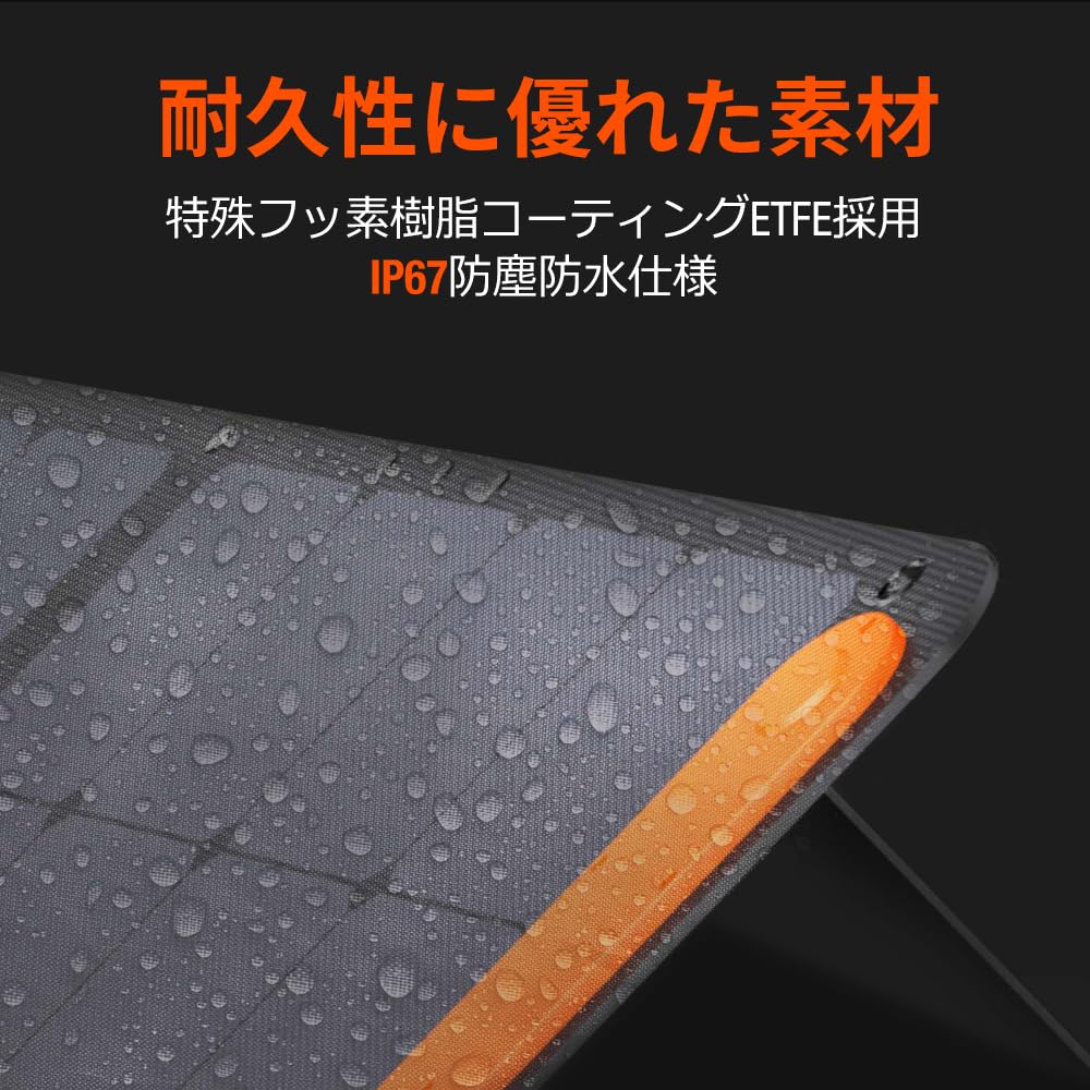 [Превосходная долговечность] Солнечная панель изготовлена из ламината ETFE, что продлевает срок ее службы и повышает прочность.. Он также имеет класс водонепроницаемости IP68, поэтому может выдерживать дождь и другие суровые погодные условия. (обратите внимание, что соединения не являются водонепроницаемыми.).