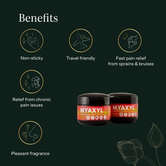 Используйте силу чистой аюрведы: Воспользуйтесь терапевтическими преимуществами 100% натуральных активных веществ. Myaxyl не содержит синтетических химикатов и отдушек, обеспечивает безопасное и эффективное снятие боли для чувствительной кожи и беременных женщин.
