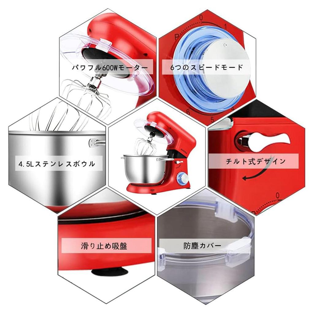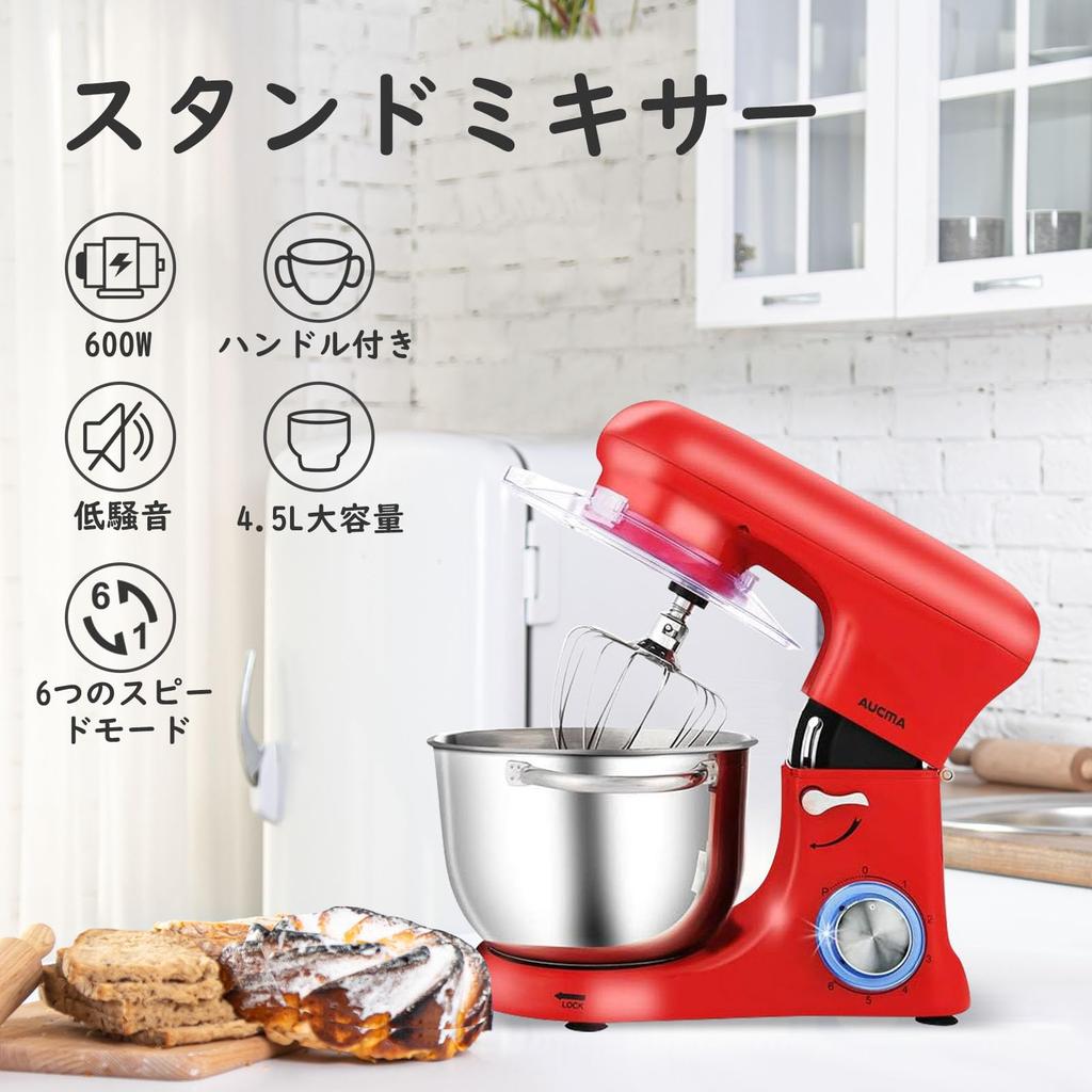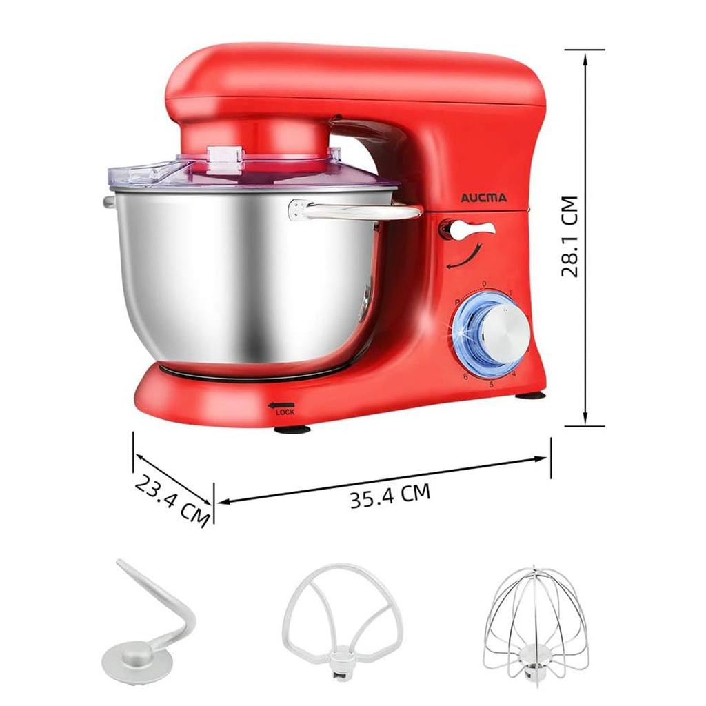 Стильный дизайн: Сочетание красного/голубого и металлического корпуса, размер как раз подходящий, очень подходит как для дома, так и для магазина.. Независимо от того, являетесь ли вы пекарем или новичком, стационарный миксер Aucma прост в использовании и сэкономит вам время и силы.. МНОГОФУНКЦИОНАЛЬНЫЕ НАСАДКИ И 6 РЕЖИМОВ СКОРОСТИ: В комплект миксера Aucma входят 3 насадки.: насадка для взбивания, крюк для теста и лопатка, а также 6 режимов скорости для удовлетворения различных кулинарных потребностей, что делает его вашим надежным помощником на кухне. Большая миска объемом 4,5 л с ручкой: В комплекте идет большая чаша из нержавеющей стали объемом 4,5 л.. Двойная ручка позволяет легко удерживать. Мощный и низкий уровень шума: Оснащен высокопроизводительным двигателем мощностью 600 Вт, обеспечивающим высокую мощность.. На основе отзывов клиентов мы улучшили проблему шума, уровень шума во время работы составляет ≤78 дБ и не будет мешать окружающим.. О гарантийном сроке: Гарантийный срок: 1 год с момента покупки. Если у вас возникли проблемы, пожалуйста, свяжитесь с нами в любое время.. Мы ответим быстро.