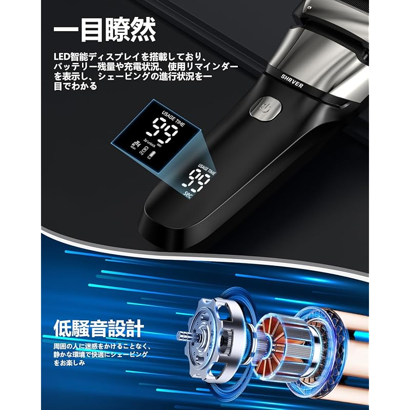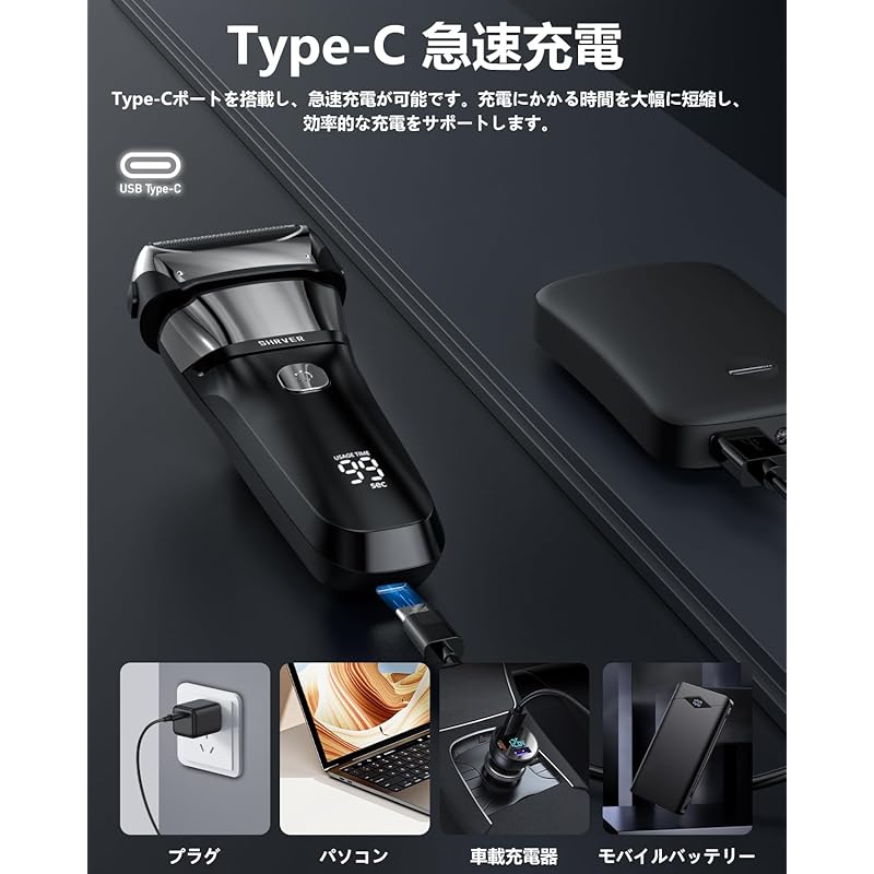 «Светодиодный интеллектуальный дисплей и быстрая зарядка Type-C» Оснащен светодиодным интеллектуальным дисплеем, который позволяет быстро проверить необходимую информацию, такую как оставшийся заряд, ход зарядки и напоминания о стирке. Кроме того, он оснащен портом Type-C, который позволяет вам побриться всего за 5 минут зарядки. Он разработан для уверенного использования даже напряженным утром или во время сборов перед выходом на улицу. Простая и удобная в использовании конструкция делает управление вашей бритвой беззаботным.