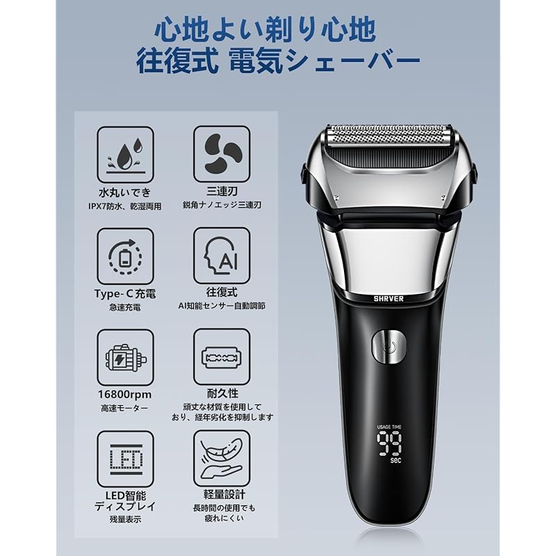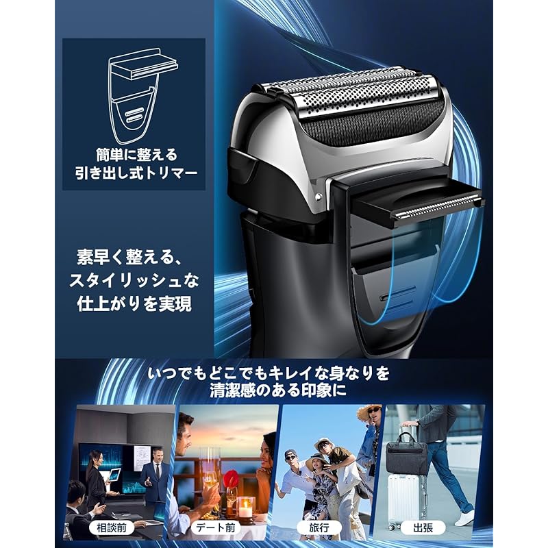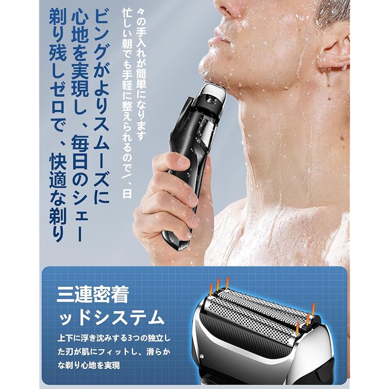 ``Удобное бритвенное сетчатое лезвие и высокоэффективный мотор'' Оснащено высокоточным сетчатым лезвием, изготовленным в Японии, и линейным мотором со скоростью около 15 000 движений в минуту, что обеспечивает гладкое и эффективное бритье. Вы можете быстро подстричь даже жесткую или густую бороду и получить гладкое бритье, не повреждая кожу. Лезвие также отличается превосходной прочностью и сохраняет остроту даже после длительного использования. Каждое утро бритье становится более комфортным и эффективным.