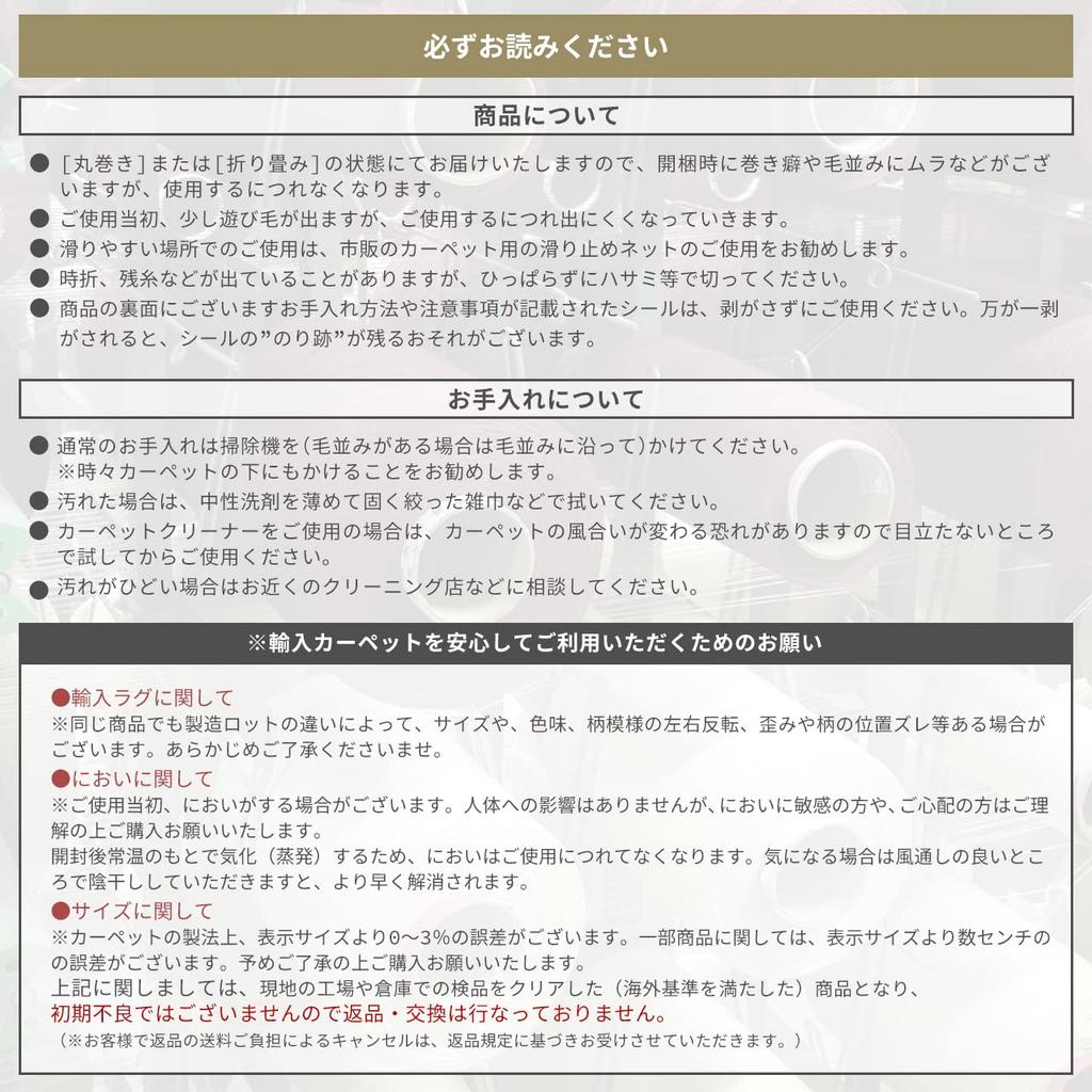 [Запросы на использование импортных ковров со спокойной душой] ●Относительно импортных ковров *Из-за различий в производственных партиях размер, цвет и рисунок одного и того же продукта могут быть противоположными или смещенными. Однако мы импортируем только продукцию, прошедшую проверку на местных заводах и складах.. Заранее благодарим за понимание. / ●О запахе *При первом использовании может ощущаться запах.. Никакого воздействия на организм человека нет, но если вы чувствительны к запахам или у вас есть опасения, пожалуйста, поймите это перед покупкой.. После открытия упаковки он испаряется. (испаряться) при комнатной температуре, поэтому запах исчезнет по мере использования. Если вас это беспокоит, высушите его в тени, в хорошо проветриваемом месте, и он исчезнет быстрее.. / ●О размере *В связи со способом изготовления ковра возможна погрешность в 0-3% от указанного размера.. / *Ни один из перечисленных дефектов не является первоначальным дефектом продукта, поэтому мы не осуществляем возврат или обмен.. (*Отмены, связанные с оплатой клиентом стоимости обратной доставки, принимаются в соответствии с политикой возврата.) / *Если на обратной стороне изделия имеется наклейка, пожалуйста, не удаляйте ее перед использованием.