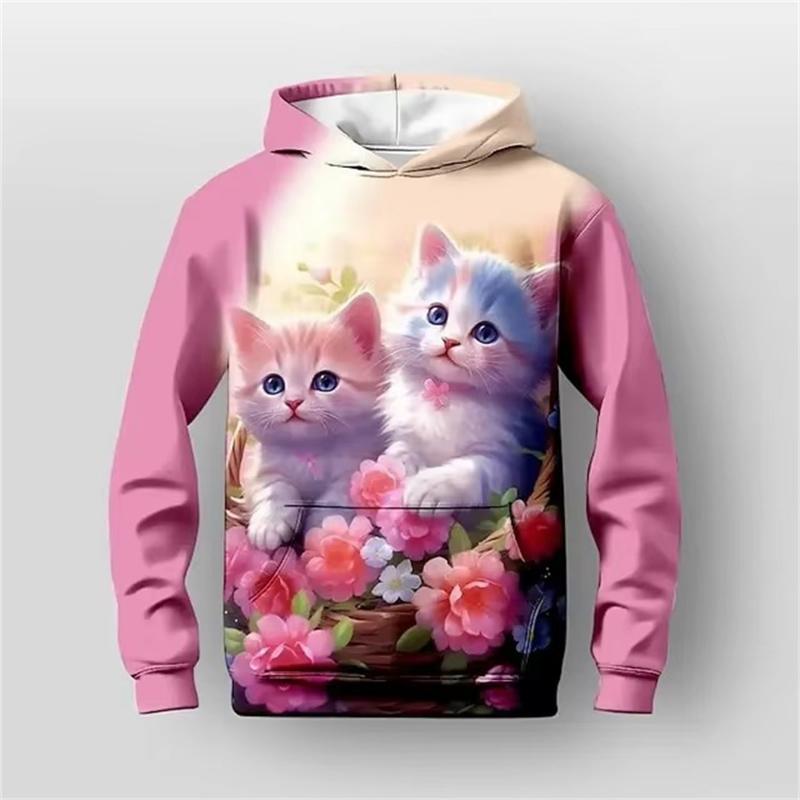 Детская одежда Толстовки с капюшоном для девочек с длинным рукавом с рисунком 3D кота Детская одежда на весну и осень Повседневная милая одежда для девочек на открытом воздухе Топы