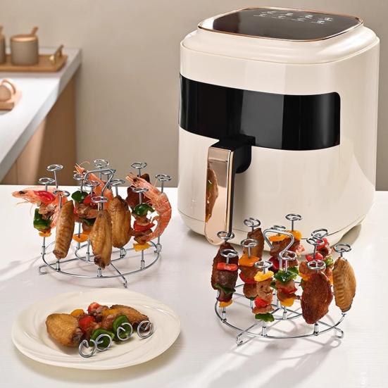 Повысьте свои кулинарные навыки с помощью нашей подставки для шампуров для фритюрницы, оснащенной многофункциональными шампурами для одновременной жарки на гриле.. С легкостью укладывайте шашлыки на верхний слой, одновременно готовя другие блюда внизу, и получайте каждый раз вкусные блюда.