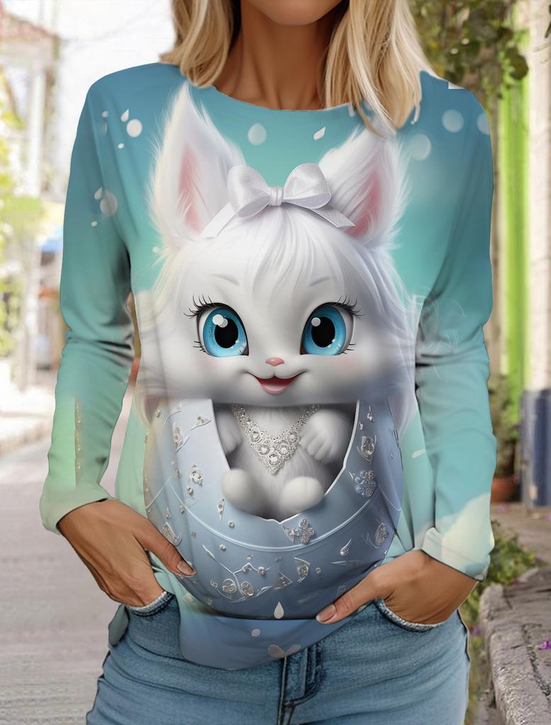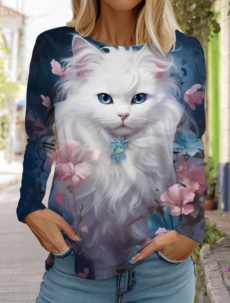 2024 Осень и зима Женская футболка с длинным рукавом с 3D-принтом и милым принтом котенка, женская уличная одежда с круглым вырезом и длинным рукавом