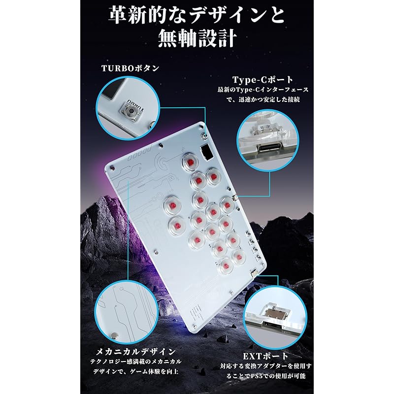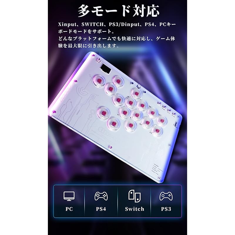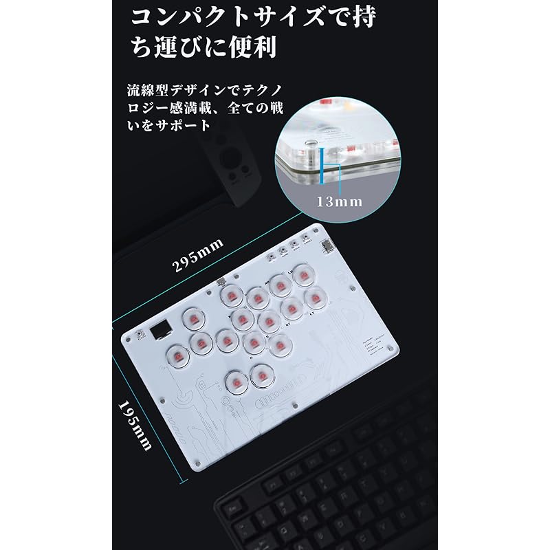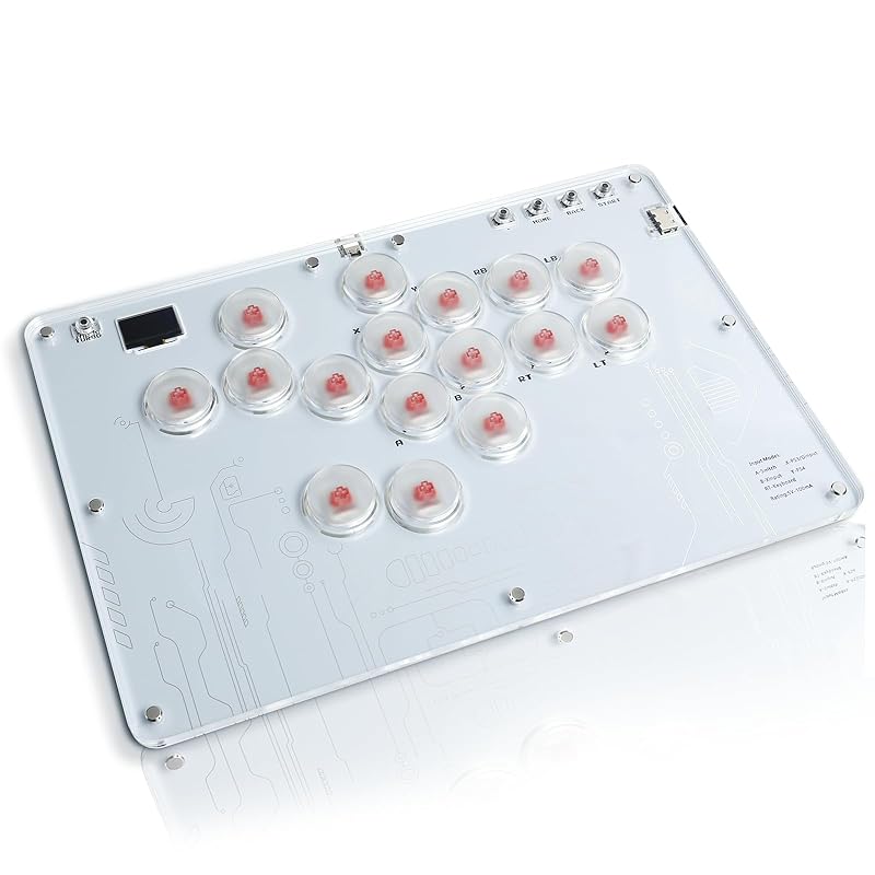 [Легкая, портативная и устойчивая конструкция] Толщина бесрычажного контроллера составляет всего 1,3 см, а его размеры — 29,5 см x 19,5 см, что позволяет разместить его на коленях или на столе. Прозрачные кнопки бесрычажного контроллера и прозрачный акриловый дизайн в сочетании со светодиодной подсветкой создают великолепную и привлекательную игровую среду. Этот бесрычажный контроллер станет вашим идеальным партнером по играм, будь то дома или в дороге.
