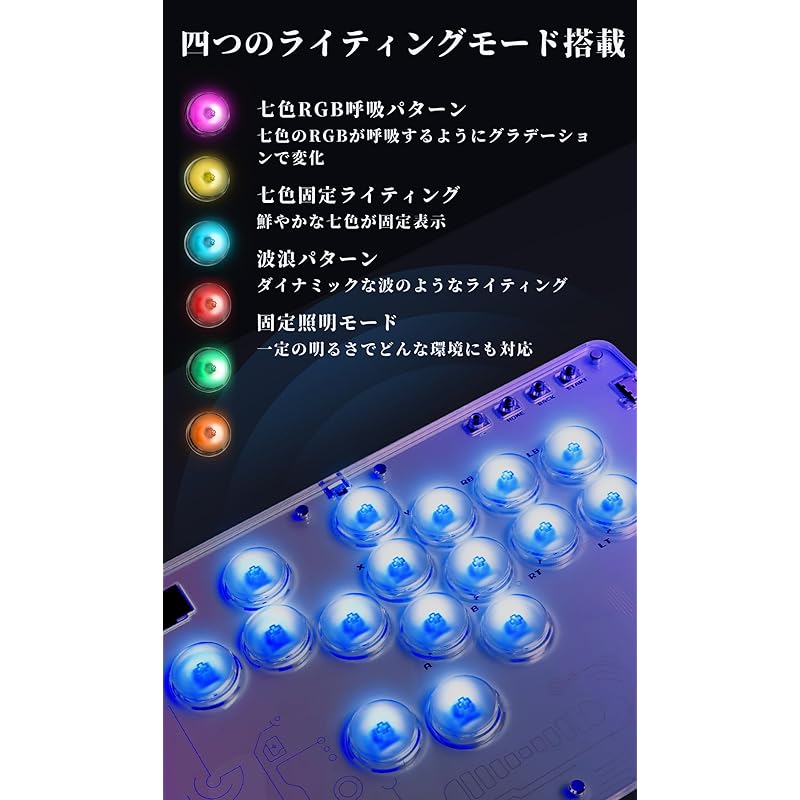 [Уникальный дизайн и световые эффекты] Бесрычажный контроллер изготовлен из прозрачного акрилового материала и имеет механический стиль рисунка, а также оснащен великолепными световыми эффектами RGB. Бесрычажный контроллер предлагает 4 различных стиля подсветки, добавляя вашему бесрычажному контроллеру уникальную индивидуальность с помощью цветов подсветки кнопок. Легко заменяемая конструкция клавиш предотвращает износ, а бесрычажный контроллер обеспечивает долговечность и длительный срок службы.