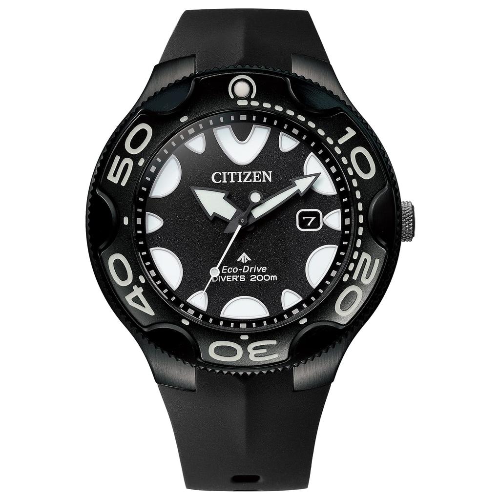[Дайверские часы с Eco-Drive] Оригинальный дизайн с мотивом косатки.. Мы уделяем особое внимание деталям, таким как обтекаемая линия корпуса, напоминающая форму косатки, пухлые часовая и минутная стрелки и уретановый ремешок, напоминающий спину косатки, когда она поднимается на поверхность.