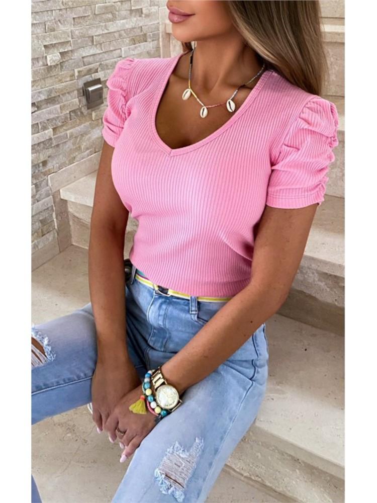 2025 Весна Лето Женская футболка V-образный вырез Нитка Повседневная мода Однотонный пуловер Рукав-фонарик Короткий рукав Женская футболка