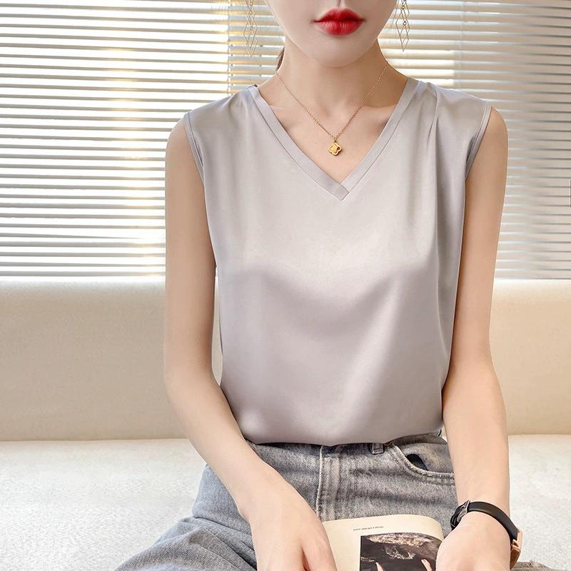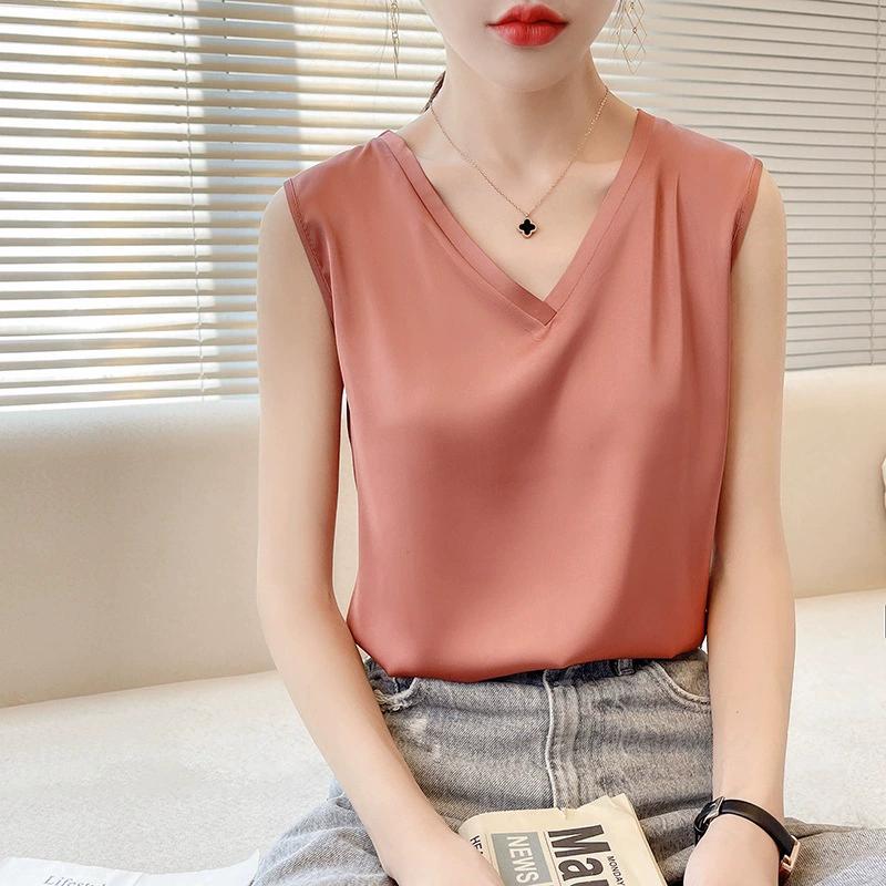 Женский летний свободный однотонный повседневный топ-майка с V-образным вырезом без рукавов с атласными низами