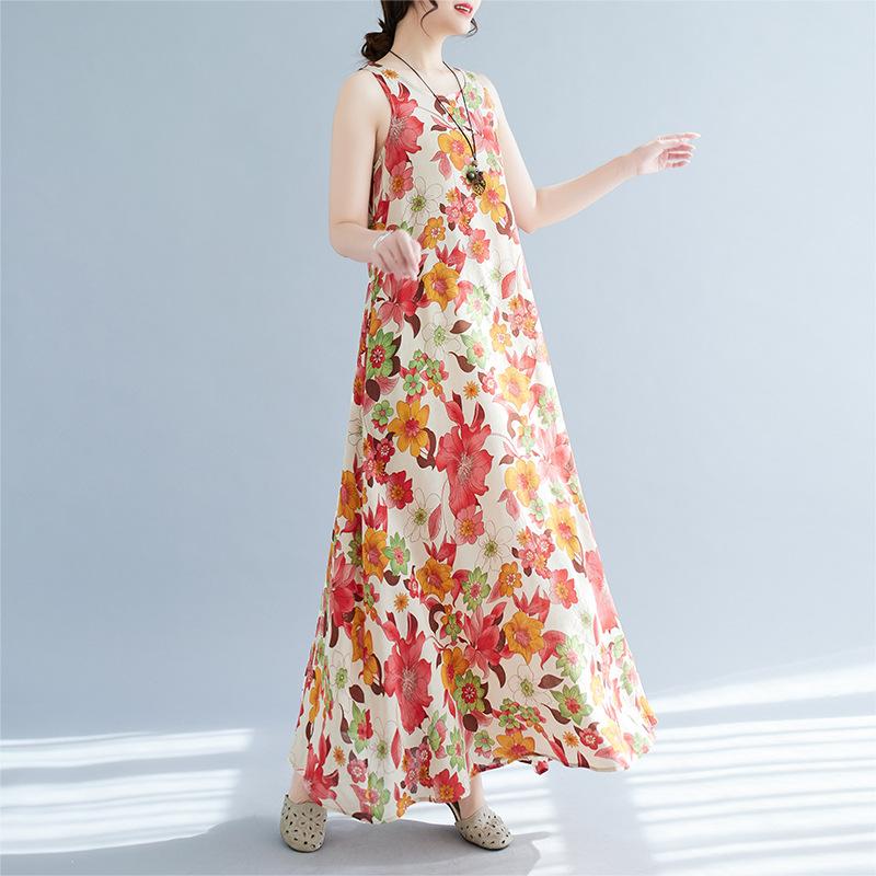 Без рукавов свободного покроя хлопковые винтажные цветочные платья для женщин повседневное свободное длинное летнее платье элегантная одежда