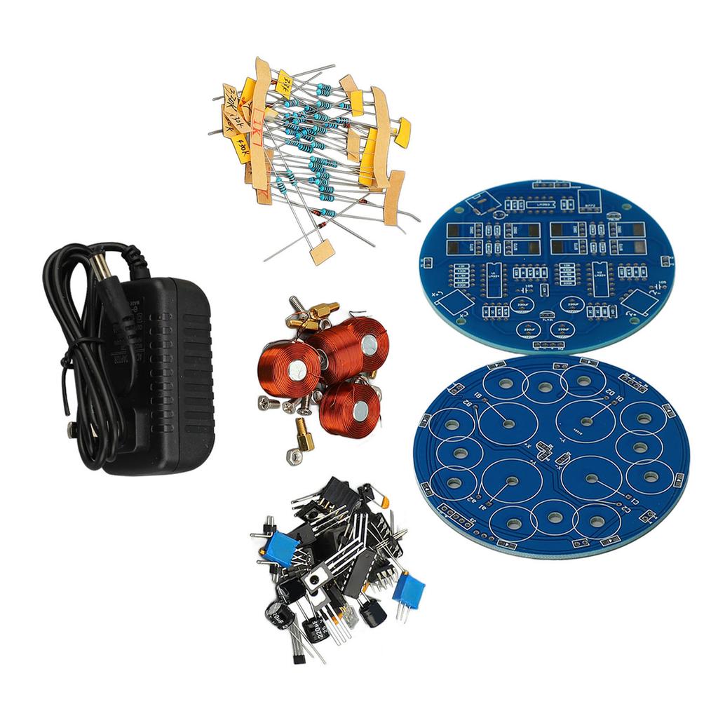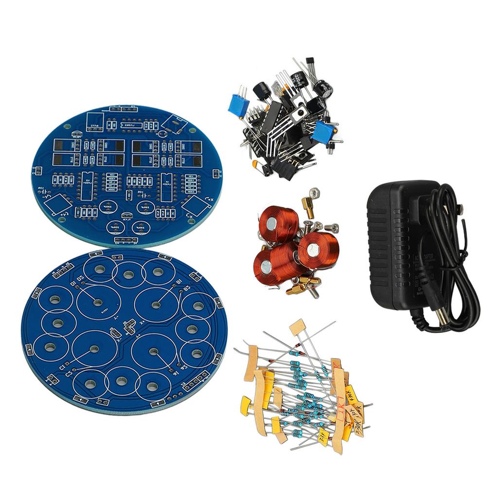 2 x печатные платы1 x вилка питания6 x листы (Железо x 3, Пластик x 3)4 x Магнитные винты, 4 x Медные столбы, 8 x Гайки, 4 x Винты, 4 Рулона x Медные провода, 8 x Стеклянные диоды, 33 x Резисторы (430K x 2, 1K x 10, 10K x 4, 330K x 4, 3.3K x 2, 5.1K x 4, 130K x 2, 20K x 1, 1.2K x 2, 180K x 2)5 x 25 В 220 мкФ электролитических конденсаторов3 x чипа (LM324 х 2, LM393 х 1)4 x штыревых разъема5 x транзисторов1 x 3-контактный разъем питания4 x керамических конденсатора (104 х 2, 105 х 2)1 x квадратный светодиодный шарик, 6 x штифтов, 2 x колпачка для соединительных проводов, 9 x силовых триодов, 2 x регулируемых потенциометра, технология магнитной левитации: В этом наборе для самостоятельной сборки модуля магнитной левитации используется технология магнитной левитации, которая позволяет добиться эффекта самовращения, декоративного и очень инновационного.