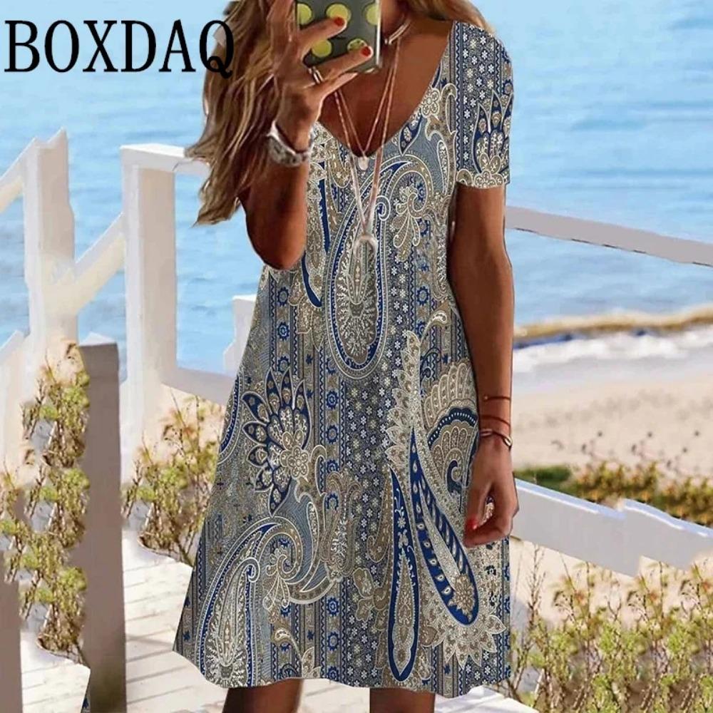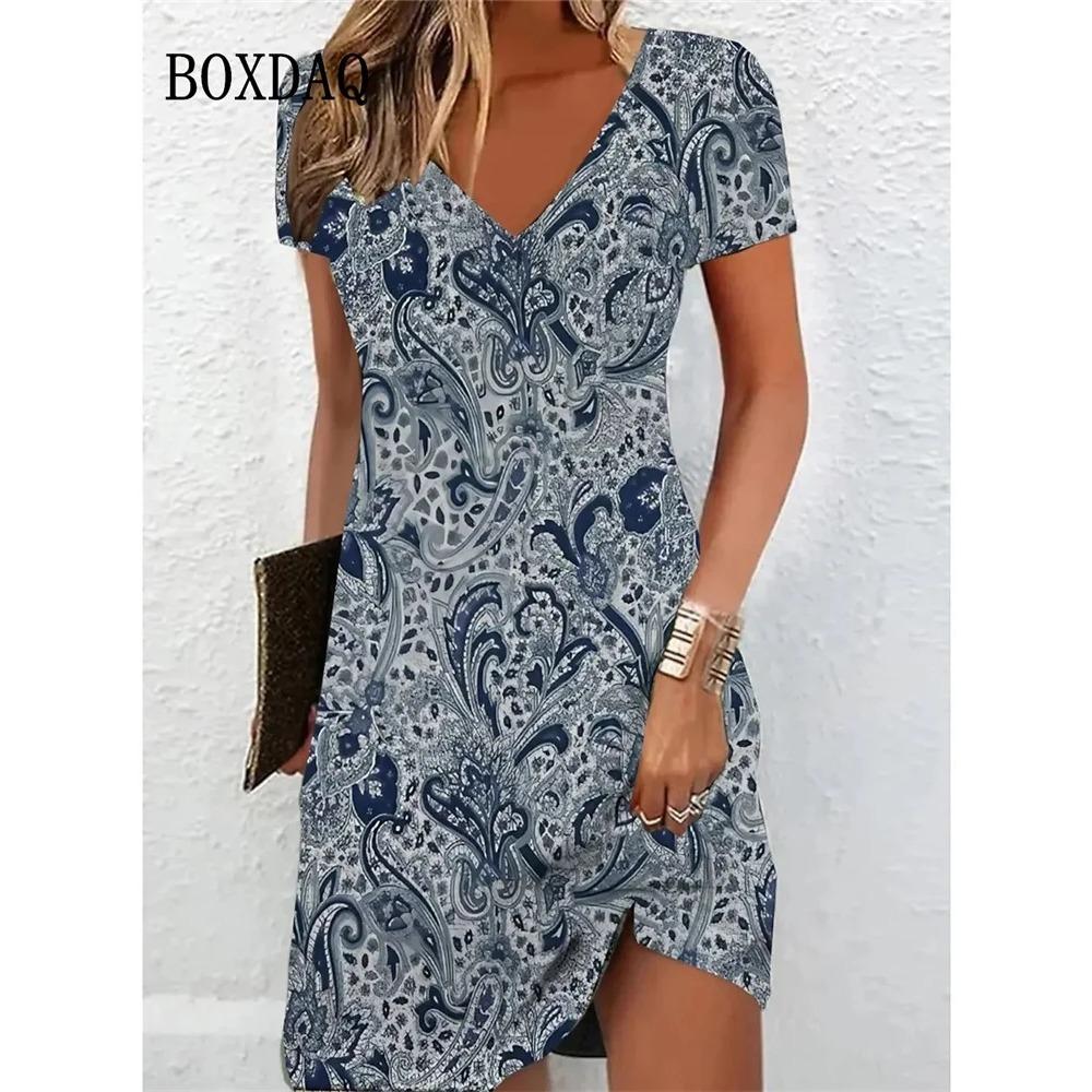 Ретро-платья с V-образным вырезом и цветочным принтом 3D, женское винтажное летнее платье А-силуэта с коротким рукавом, элегантное вечернее платье, женское повседневное свободное платье в стиле бохо