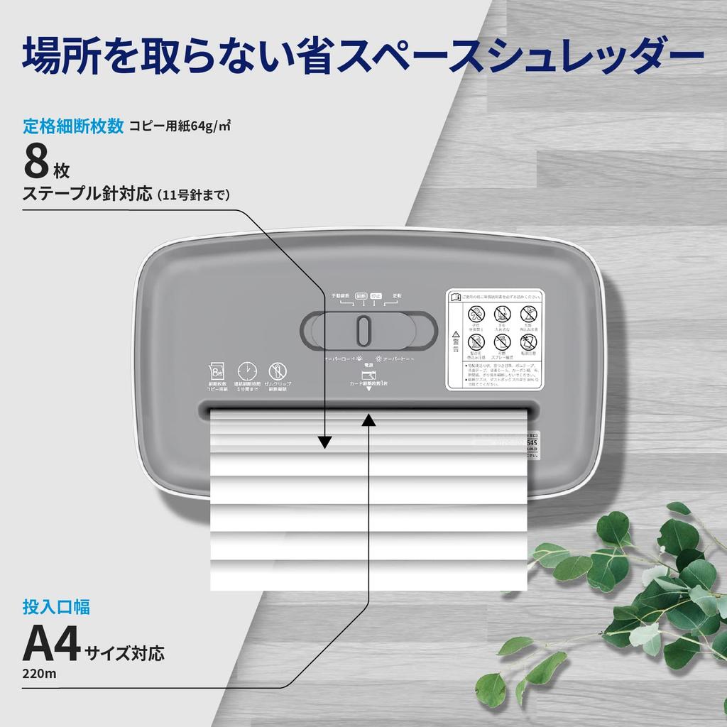 Производительность продукта] Максимальное количество измельченных листов: 8 листов бумаги формата А4 (64г/м2) кредитная карта на листе / размер измельчения: 5 х 18 мм (поперечный разрез) / Номинальное время непрерывной работы: 4 минуты / Скорость измельчения: приблизительно. 2,0 м/мин (50/60 Гц)