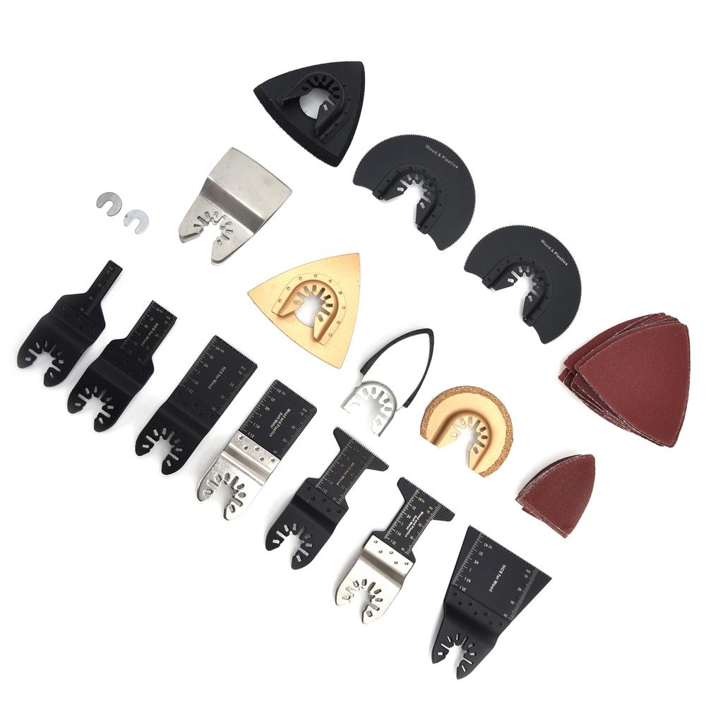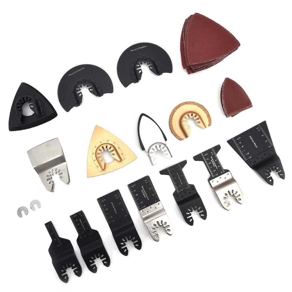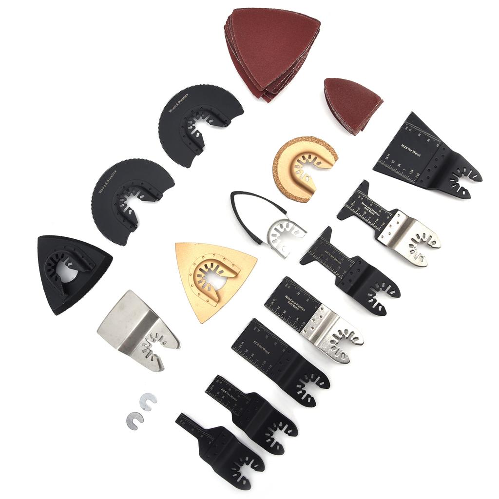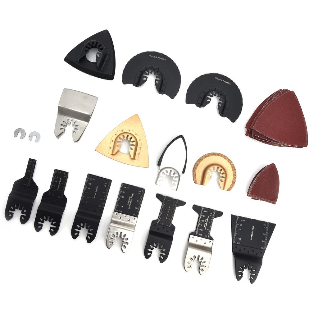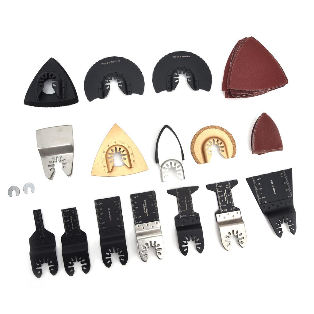 Полный комплект принадлежностей: Комплект пильного полотна является полным, включая колеблющиеся пильные полотна, сплавные диски, треугольные наждачные бумаги и прокладки и т. Д.