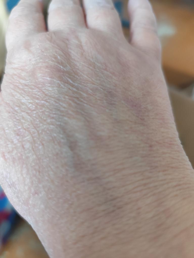 Снимаю звезду за зверски измятую коробочку. На флаконе местами потерта позолота. Немного крема вытекло в коробочку. По качеству. Это средство из тех, что мы видим на китайских моделях. Белые вкрапления - явно светоотражающие частицы, которые маскируют мелкие морщины. Не на каждый день, а для особых случаев. Визуально - действительно эффект моментального лифтинга, но это не лечебный, а именно визуальный результат. Когда планируете "сбросить" десяток лет на несколько часов. Посмотрите на мою руку на фото. Мазнула кремом небольшой участок кожи, покрытой морщинками. Вокруг морщины есть, а в центре, где вены, их нет. Происходит это в момент т нанесения. Сколько держится - пока не знаю. В принципе, должно быть несколько часов.