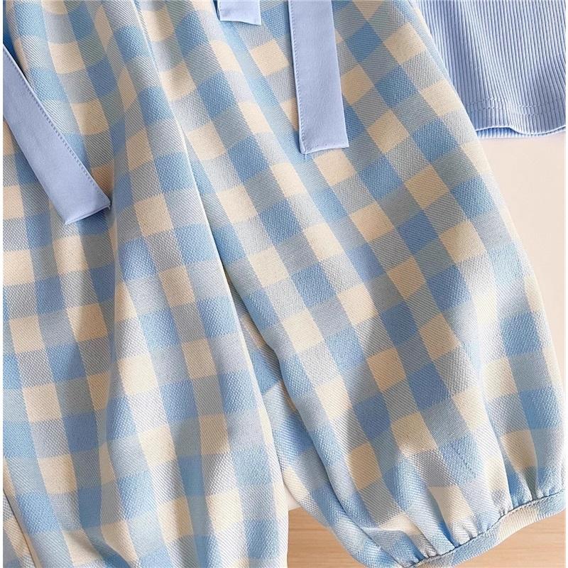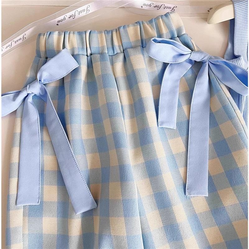 Летний детский костюм в синюю клетку, топ без рукавов с бантом, широкие брюки и сумка через плечо, комплект из трех предметов