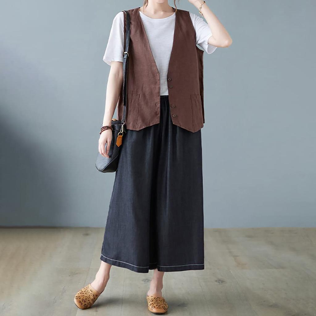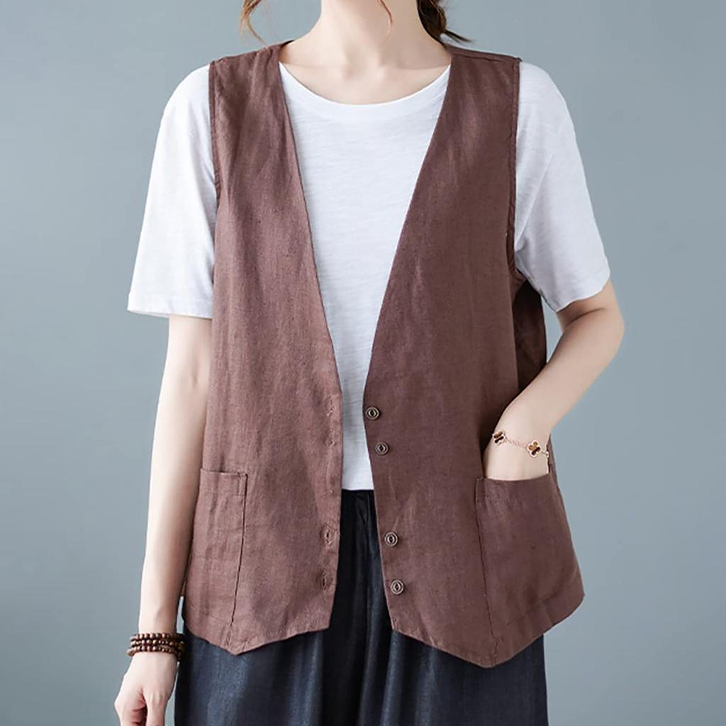 Женский хлопковый льняной жилет без рукавов на пуговицах с V-образным вырезом, куртка-жилет