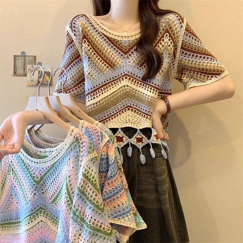 Трикотажная рубашка из ледяного шелка с вышитым ажурным узором в богемном стиле и короткими рукавами с цветочным узором в этническом стиле 1 — купить товар онлайн с бесплатной доставкой по всему миру!