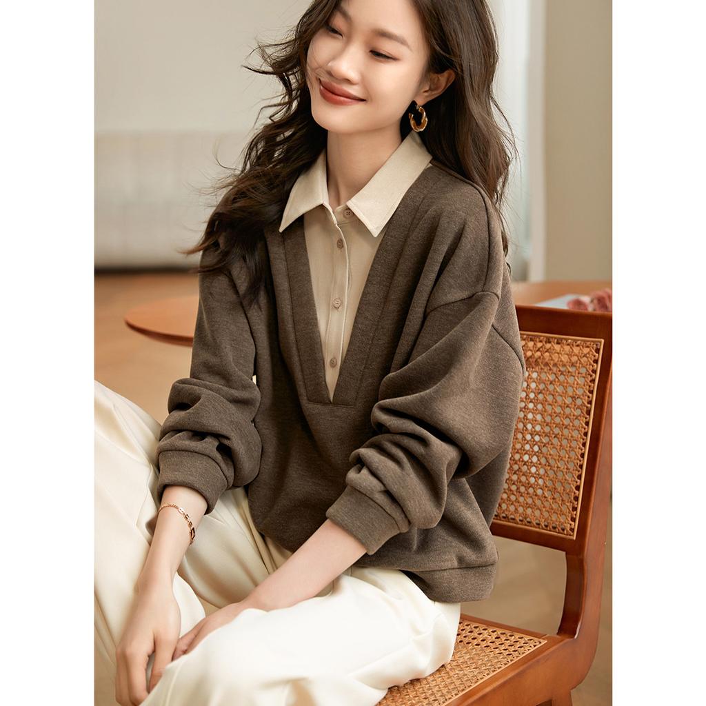 Рубашка воротник поддельные два свитера новый осенний утолщенный теплый твил полированный топ женский