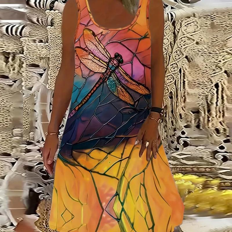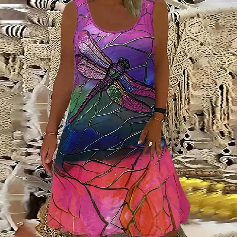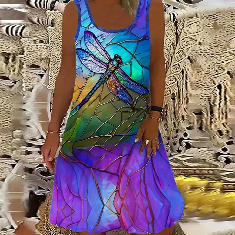 Женское платье из двух частей с принтом в виде летящих стрекоз и роз, без рукавов, с круглым вырезом, свободное, мягкое и удобное, большого размера