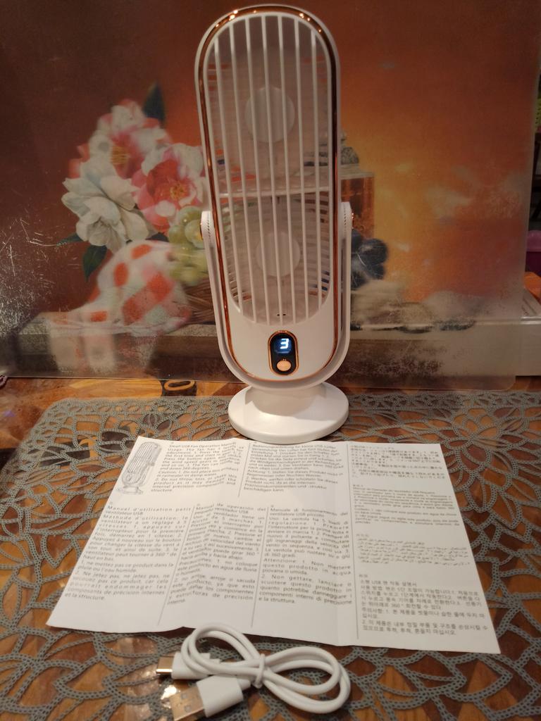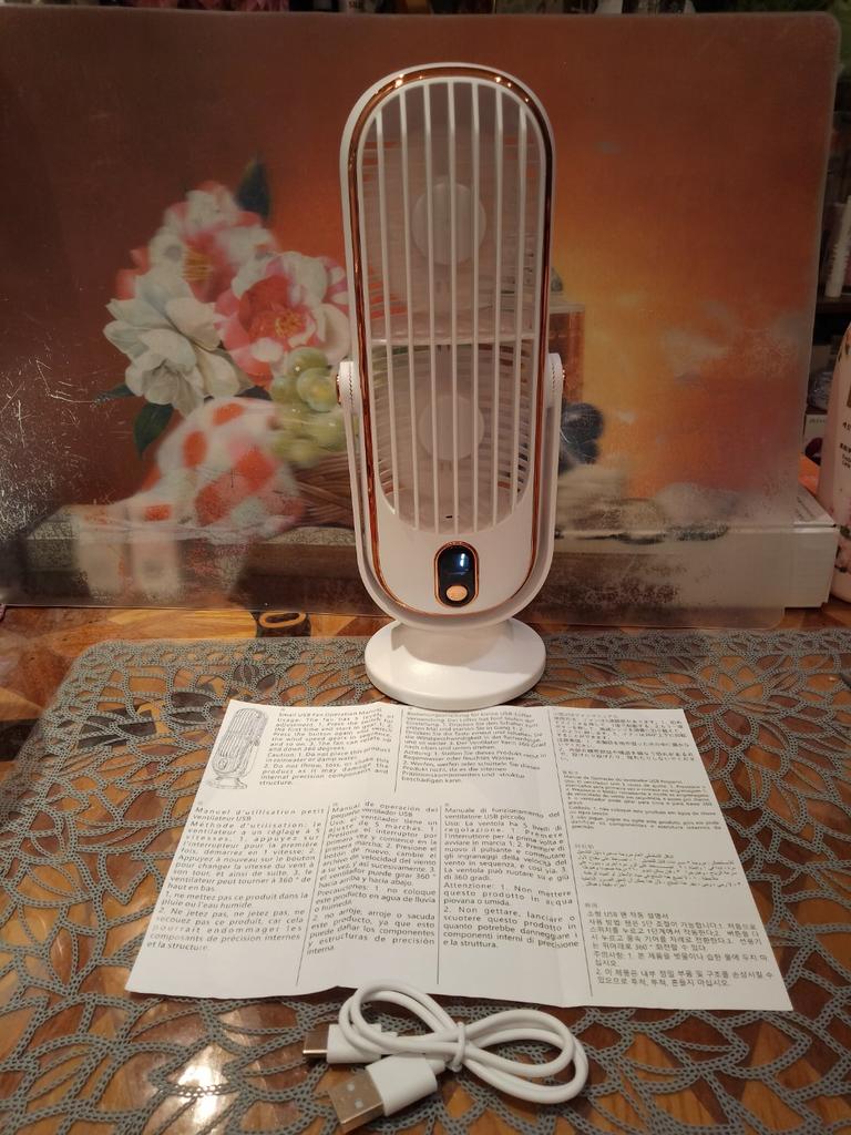 Крутой вентилятор. Имеет 5 скоростей. Пришёл заряженный с инструкцией и usb проводом. Пришёл в помятой коробке, но на товар это никак не повлияло.