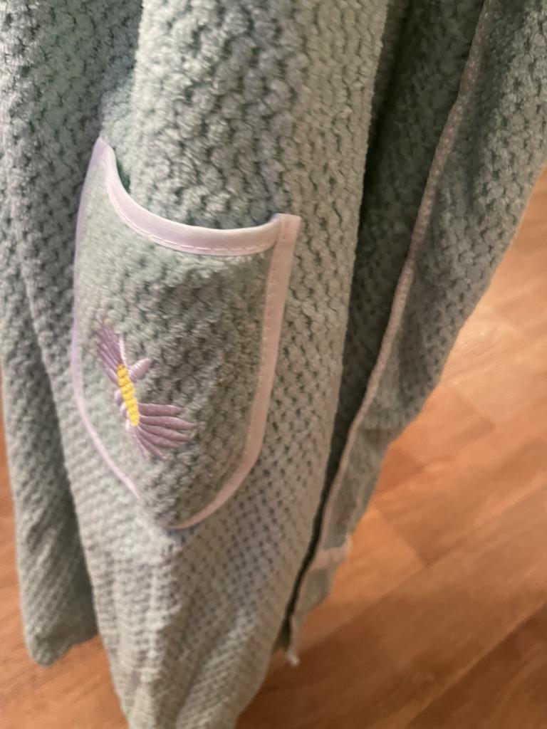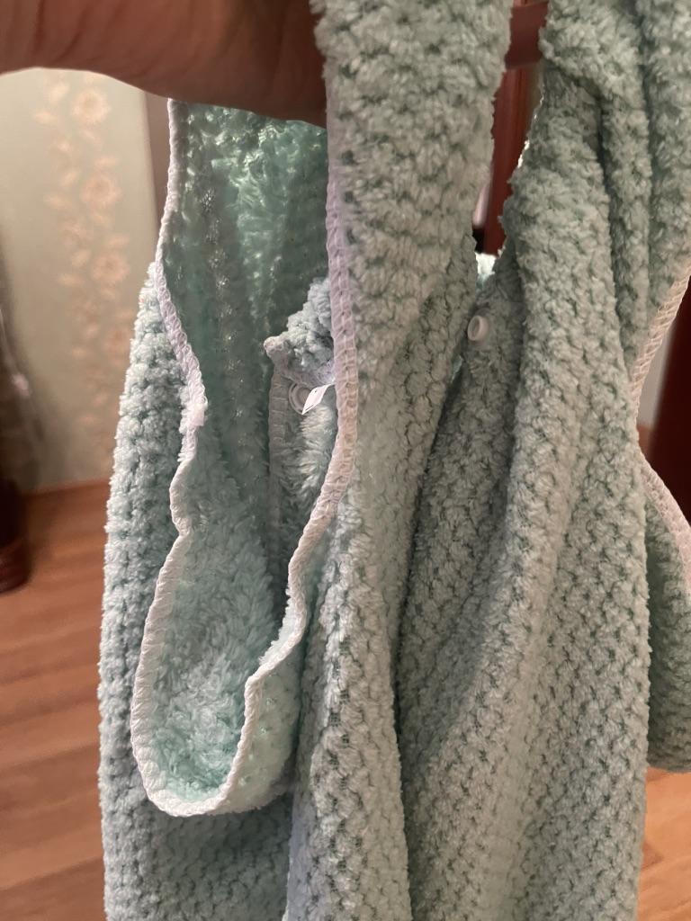 Халатик так себе штучка , ткань махра очень токая, по краям скручивается, цвет грязно зеленый, застежки 3 кнопочки две сверху одна на животе, в области груди нет, поэтому все на груди расползается, размер мой, еще не стирала, думаю после стирки на тряпки порежу, форму точно держать не будет. Не рекомендую категорически.