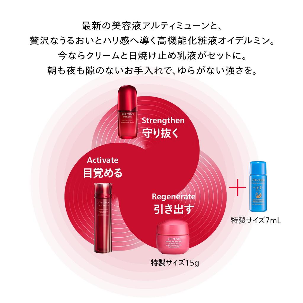 "Название продажи: SHISEIDO Ultimune Powerizing Serum" Ферментированный экстракт камелии +* и тщательно отобранные косметические ингредиенты доставляются в каждый уголок 30 миллионов клеток рогового слоя кожи. При ежедневном уходе утром и вечером ваша кожа станет более упругой, гладкой, чистой и сияющей, а также наполненной влагой.. *Экстракт семян камелии, культура аспергилла, глицерин: Увлажняющий. "Название продажи: SHISEIDO Eidermin Essence Lotion" Обновляйте свою красоту каждый день. Делает вашу кожу сияющей и полной жизни.. Мы сосредоточены на восстановлении красоты, которая до сих пор не была полностью раскрыта.. Стремитесь к прекрасному циклу кожи, устойчивой к сухости и изменениям окружающей среды, и выработайте привычку удалять плохие вещи и вводить хорошие.. Быстро проникает в каждый уголок рогового слоя кожи, делая мелкие морщинки, вызванные сухостью, менее заметными.. * Делает кожу сияющей, прозрачной, увлажненной и гладкой. *Проверена оценка эффективности