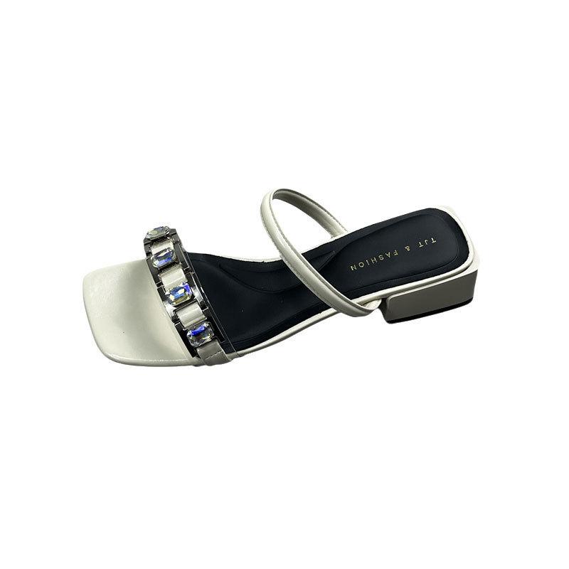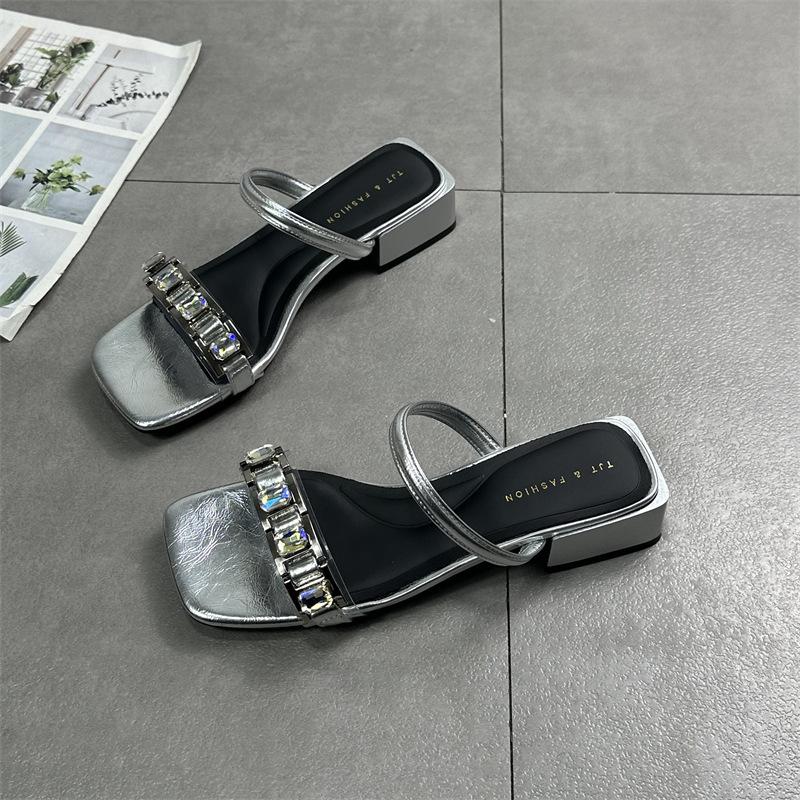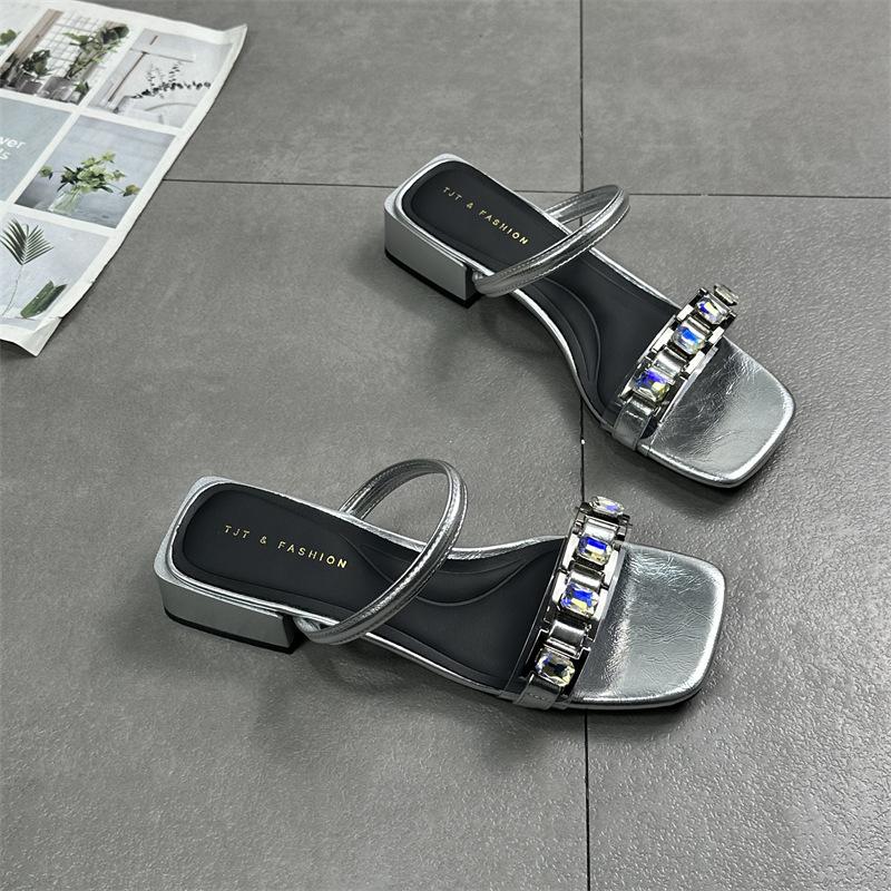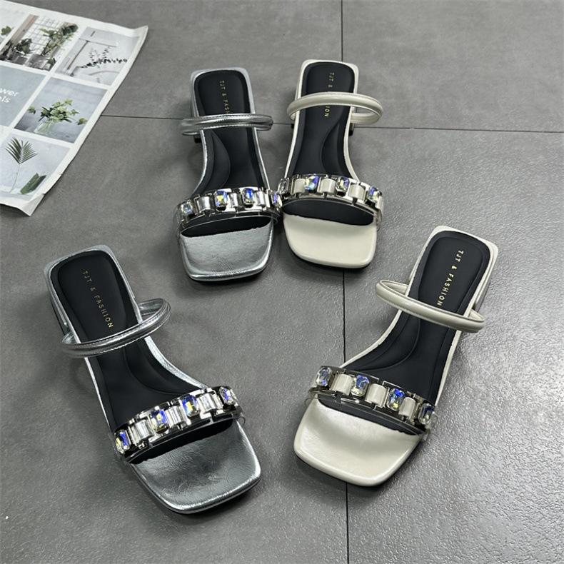 Женская обувь 2024 года, лето, новые универсальные туфли с квадратным носком, открытым носком, стразами, средний каблук, классные тапочки в стиле знаменитостей из Интернета, полудраг, односложные