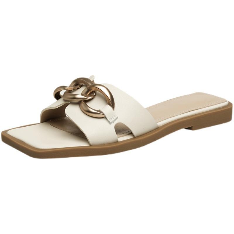 Интернет-знаменитости ins металлическая пряжка открытый носок крутые тапочки женские прилив 2025 летние квадратные носок плоский низ модная одежда полутапочки