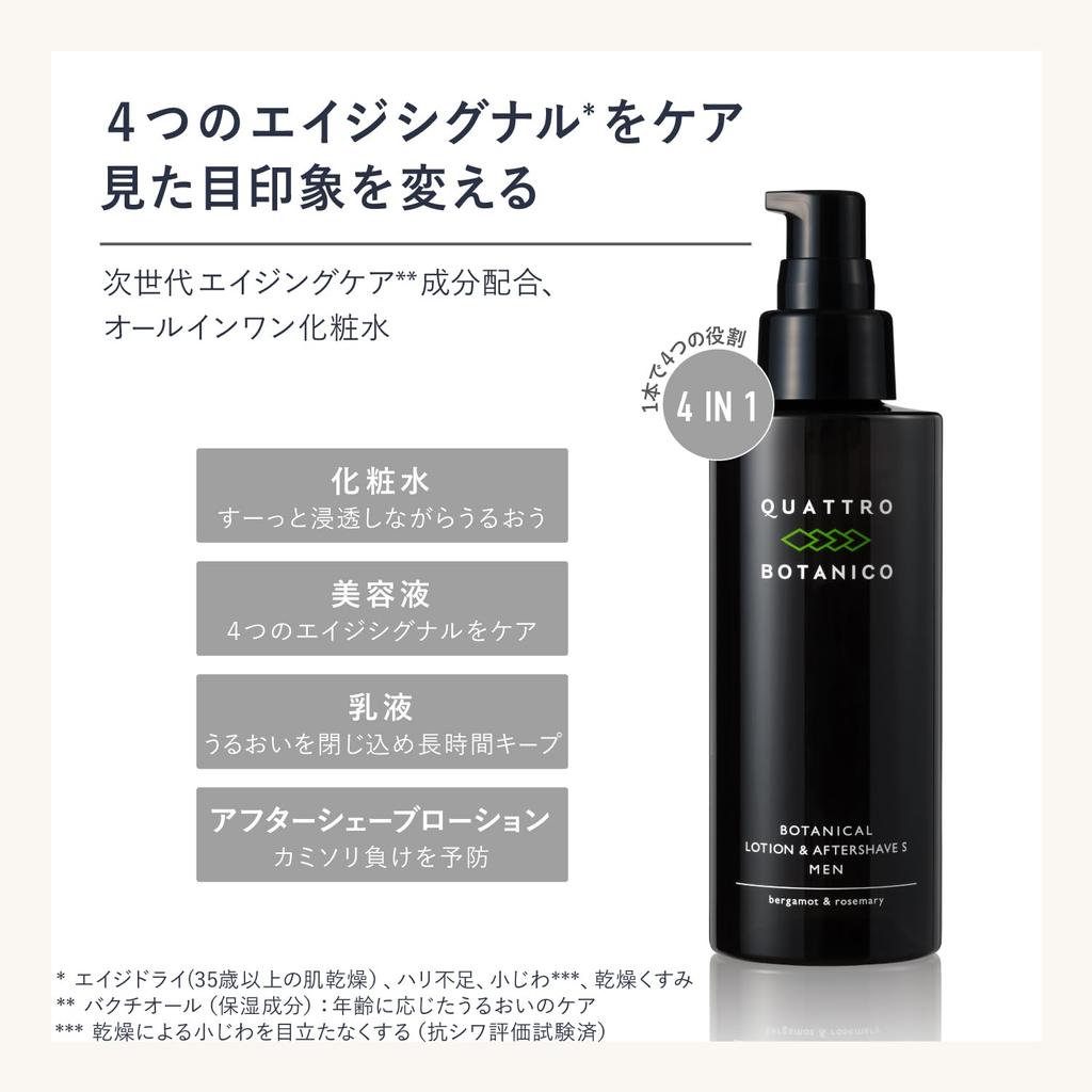 [Четыре функции в одной] Универсальный мужской лосьон, который обеспечивает четыре эффекта: лосьон, сыворотка, молочко и лосьон после бритья. После умывания или бритья вы можете привести свое лицо в порядок всего одним нажатием! Это средство по уходу за кожей, которое мужчины, желающие ценить свою кожу и время, могут продолжать использовать.. Его могут использовать мужчины с любым типом кожи, включая сухую, чувствительную и жирную кожу.. сделано в Японии.