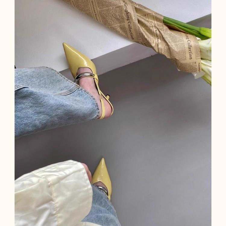 Туфли на шпильках с острым носком и сумкой на голове женские босоножки весна-лето 2025 новые металлические резинки сзади пустые красивые одинарные туфли женские