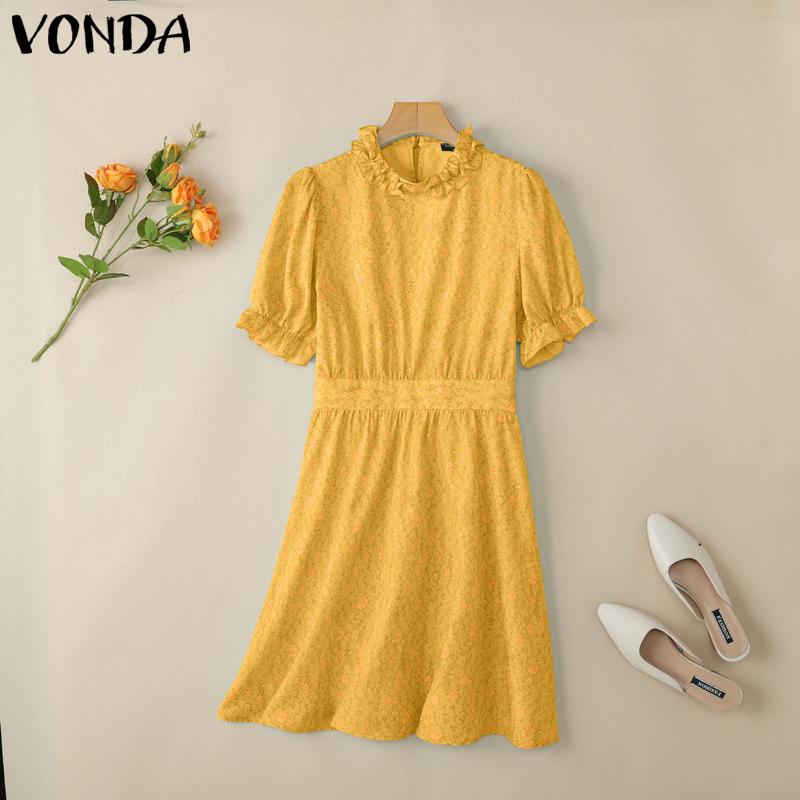 VONDA Женское летнее платье-сарафан с оборками, воротником-стойкой, коротким рукавом, цветочным принтом, повседневное, с приталенной талией — купить товар онлайн с бесплатной доставкой по всему миру!