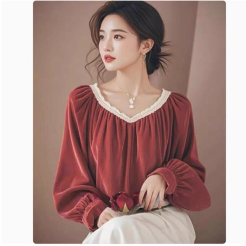 Ankola Красная бархатная рубашка с V-образным вырезом и рукавами-фонариками, женская осенняя рубашка с французским темпераментом, легкая роскошная кружевная вставка