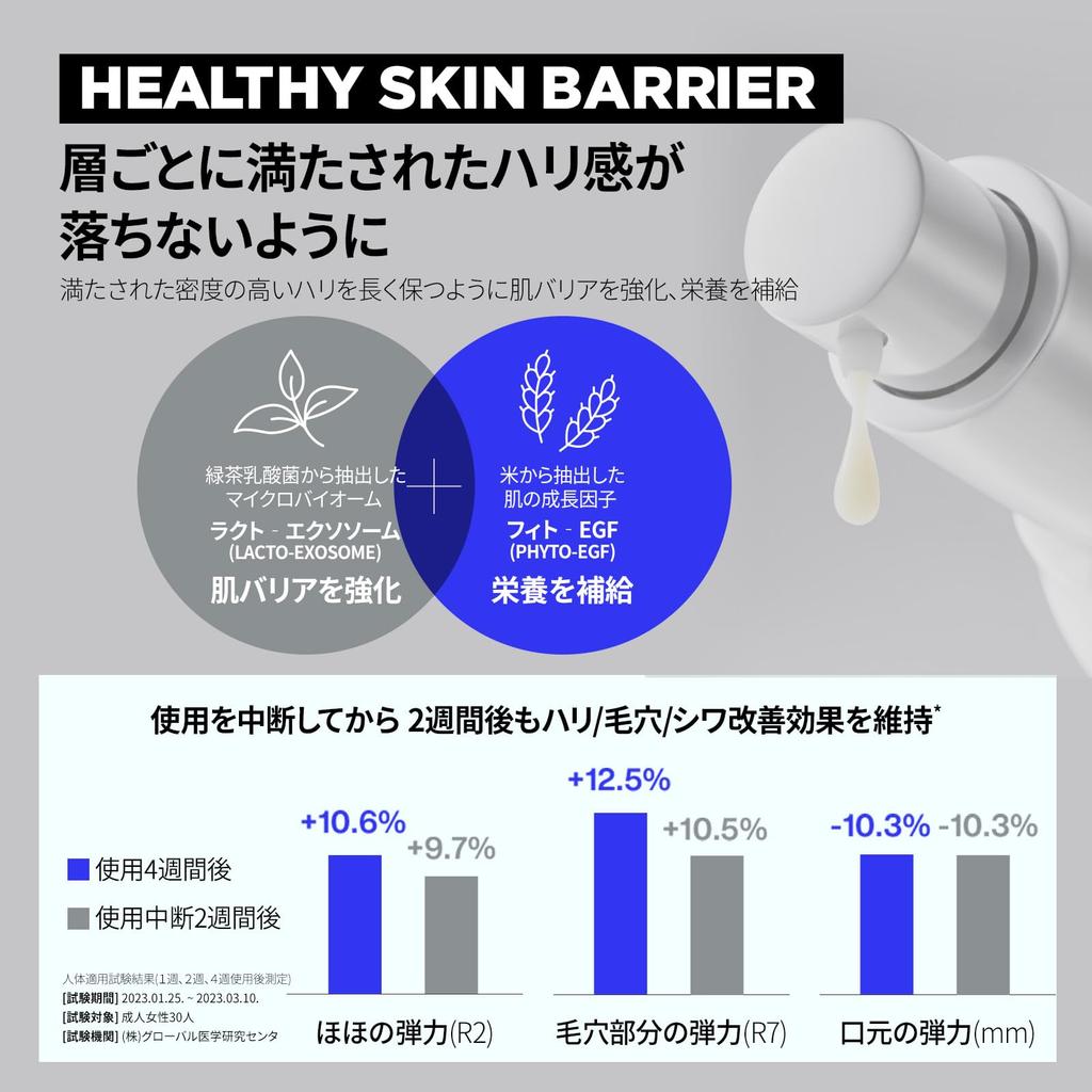 [Уход за упругостью, морщинами и порами] Содержит микробиом ``Лакто-Экзосома'', извлеченный из молочнокислых бактерий зеленого чая, и фито-EGF, фактор роста кожи, извлеченный из риса, для поддержания упругости, разглаживания морщин и ухода за порами в течение длительного времени даже после 2 недель использования.