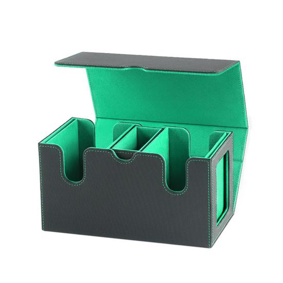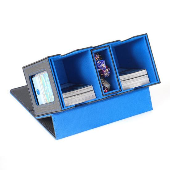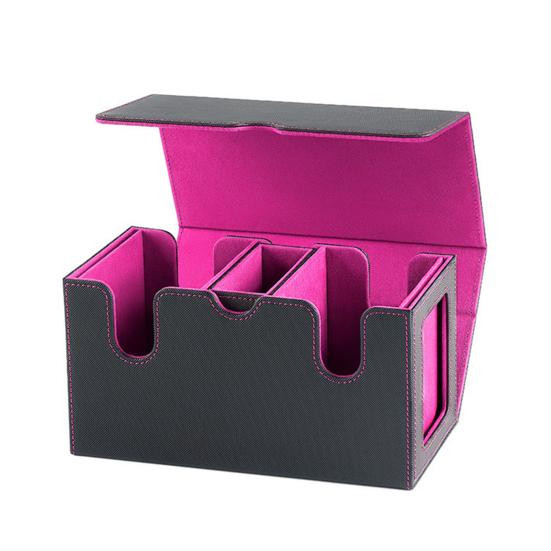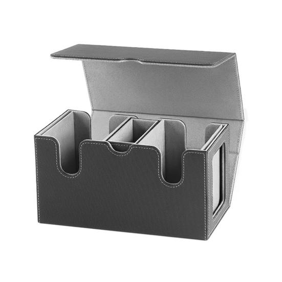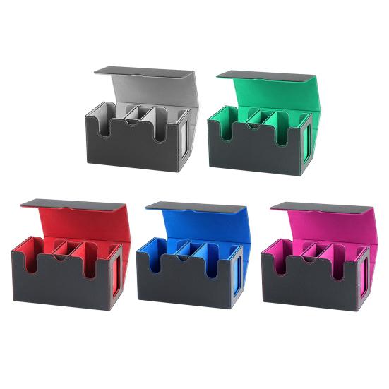 В этой коробке с двумя отделениями можно хранить до 200 карт в двойном футляре, 250 карт в одинарном футляре или 400 карт без футляра.. Уникальное U-образное отверстие обеспечивает легкий доступ к картам во время игры.. Кроме того, двухслойные перегородки и четыре встроенных разделителя помогут вам аккуратно организовать свою коллекцию карт.